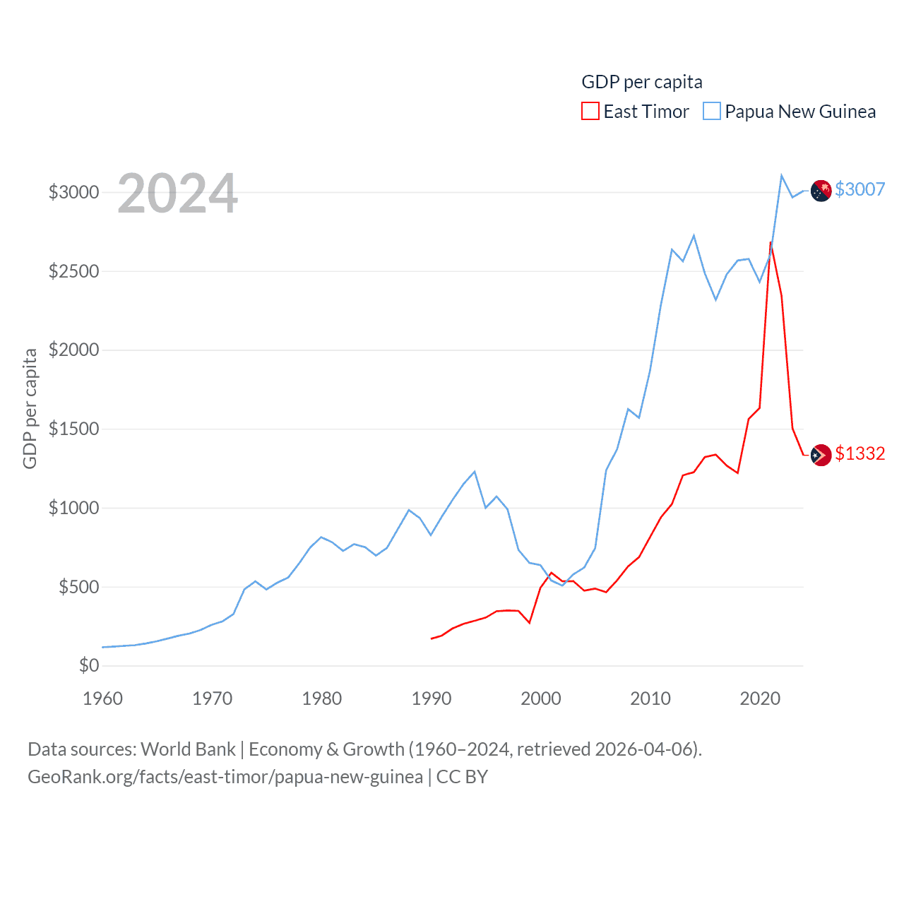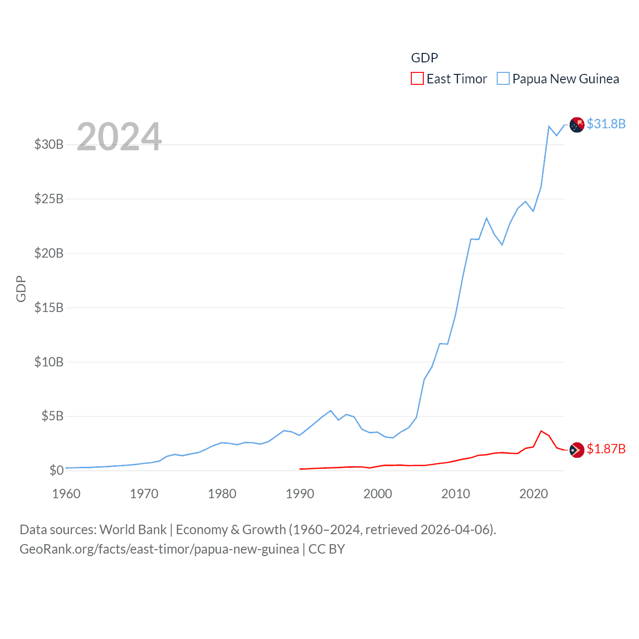 By GDP, East Timor ranks 181/197 ($1.87B) and Papua New Guinea ranks 110/197 ($31.8B). By GDP per capita, East Timor ranks 167/197 ($1,332), while Papua New Guinea ranks 140/197 ($3,007).