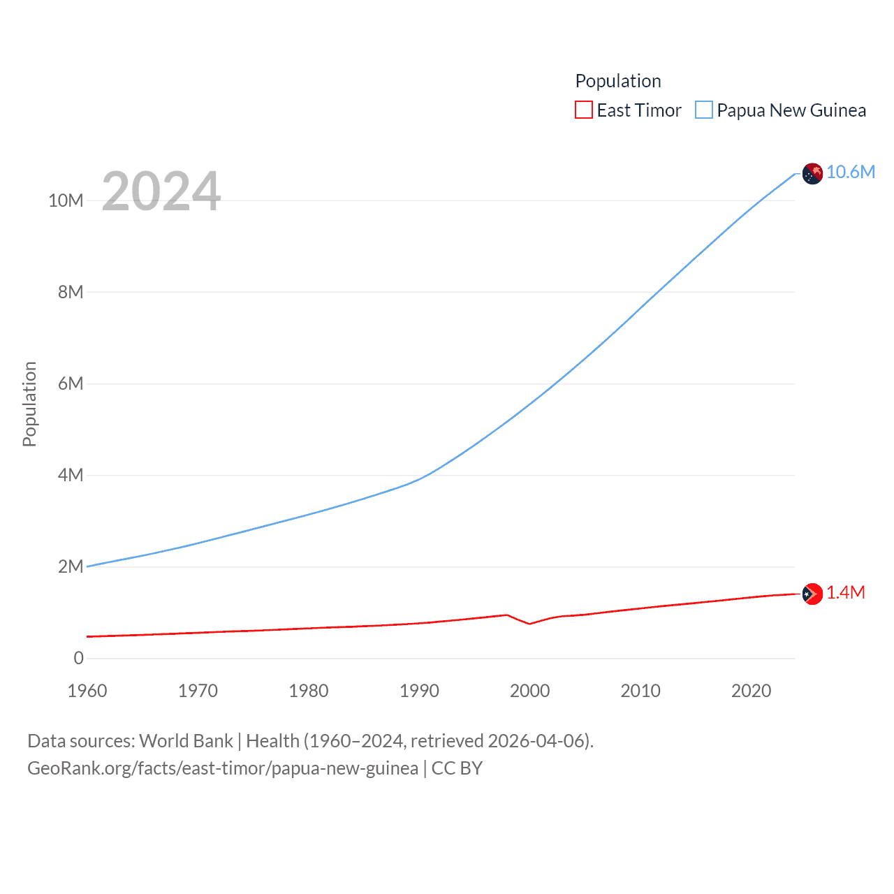 East Timor has a population of 1.4M (ranked 152/197), compared with 10.6M in Papua New Guinea (ranked 92/197). East Timor's land area is 5,741 sq mi versus 174,850 sq mi for Papua New Guinea (ranked 155th vs. 54th).