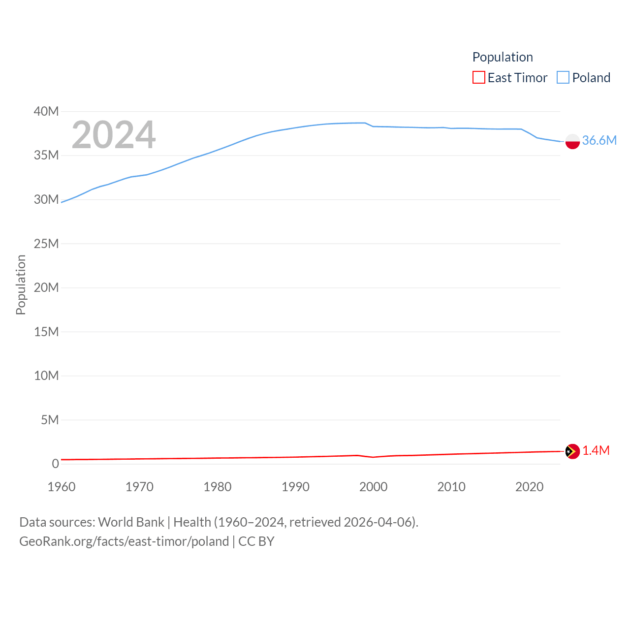 East Timor has a population of 1.4M (ranked 152/197), compared with 36.6M in Poland (ranked 42/197). East Timor's land area is 5,741 sq mi versus 118,252 sq mi for Poland (ranked 155th vs. 69th).