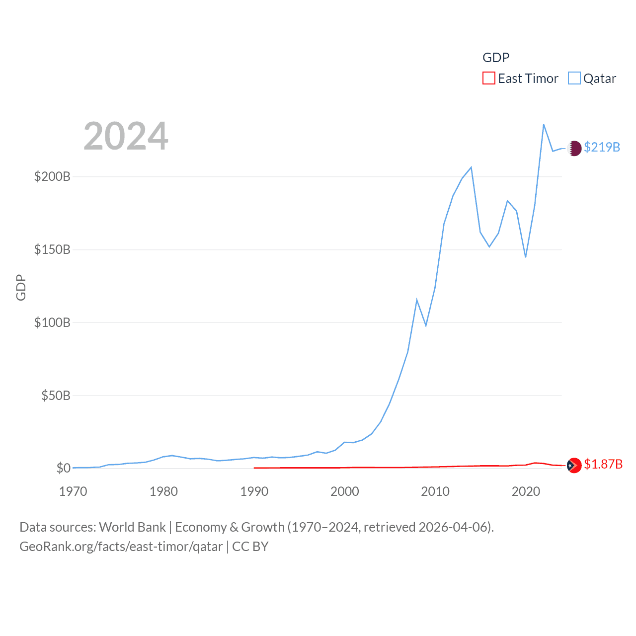By GDP, East Timor ranks 181/197 ($1.87B) and Qatar ranks 56/197 ($219B). By GDP per capita, East Timor ranks 167/197 ($1,332), while Qatar ranks 11/197 ($76,689).