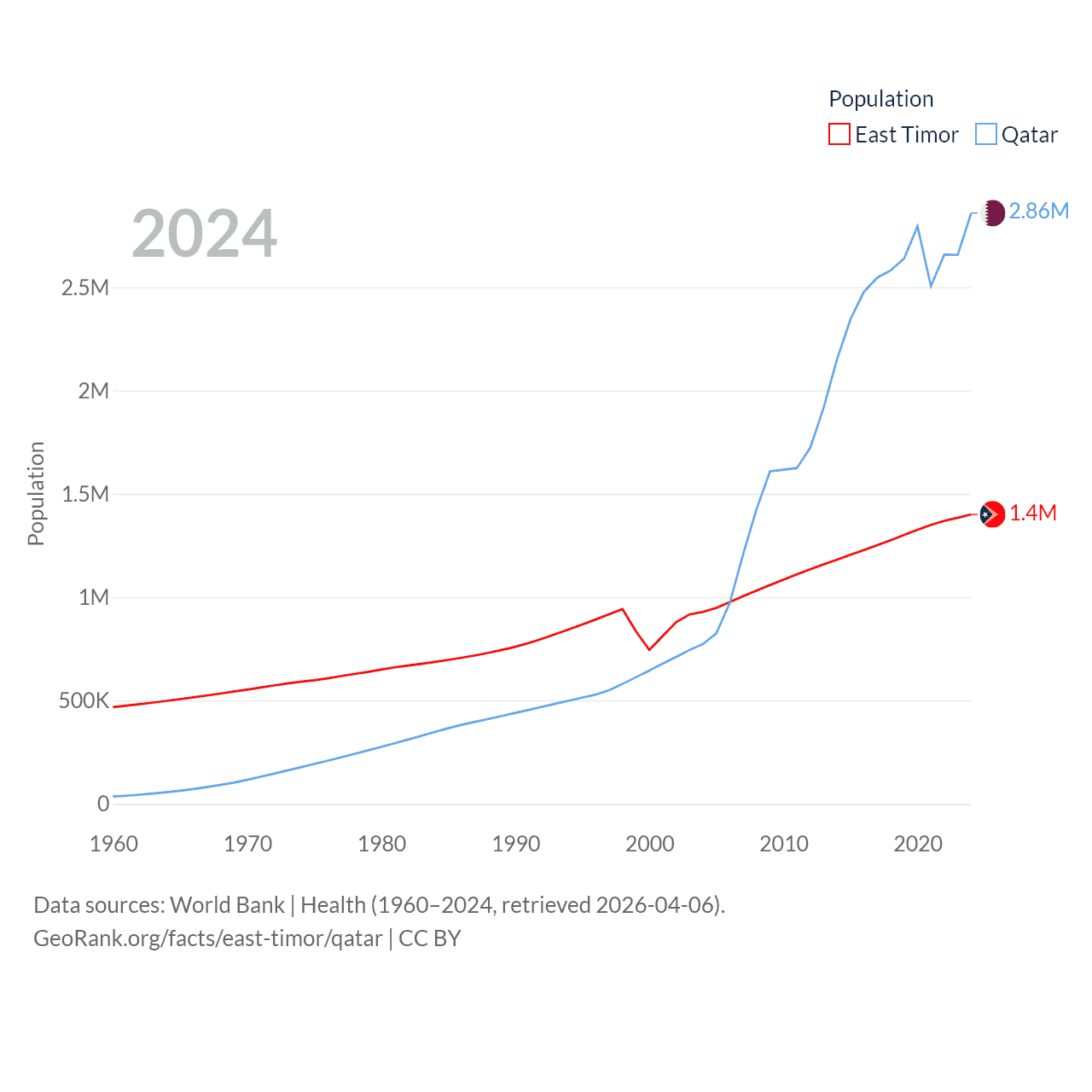 East Timor has a population of 1.4M (ranked 152/197), compared with 2.86M in Qatar (ranked 138/197). East Timor's land area is 5,741 sq mi versus 4,436 sq mi for Qatar (ranked 155th vs. 158th).