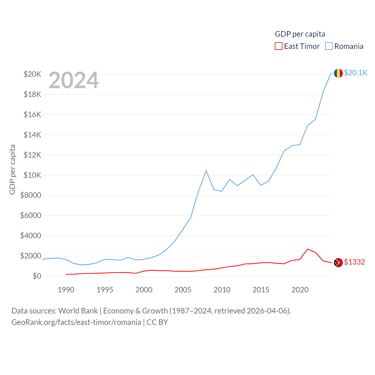 By GDP, East Timor ranks 181/197 ($1.87B) and Romania ranks 42/197 ($383B). By GDP per capita, East Timor ranks 167/197 ($1,332), while Romania ranks 58/197 ($20,080).