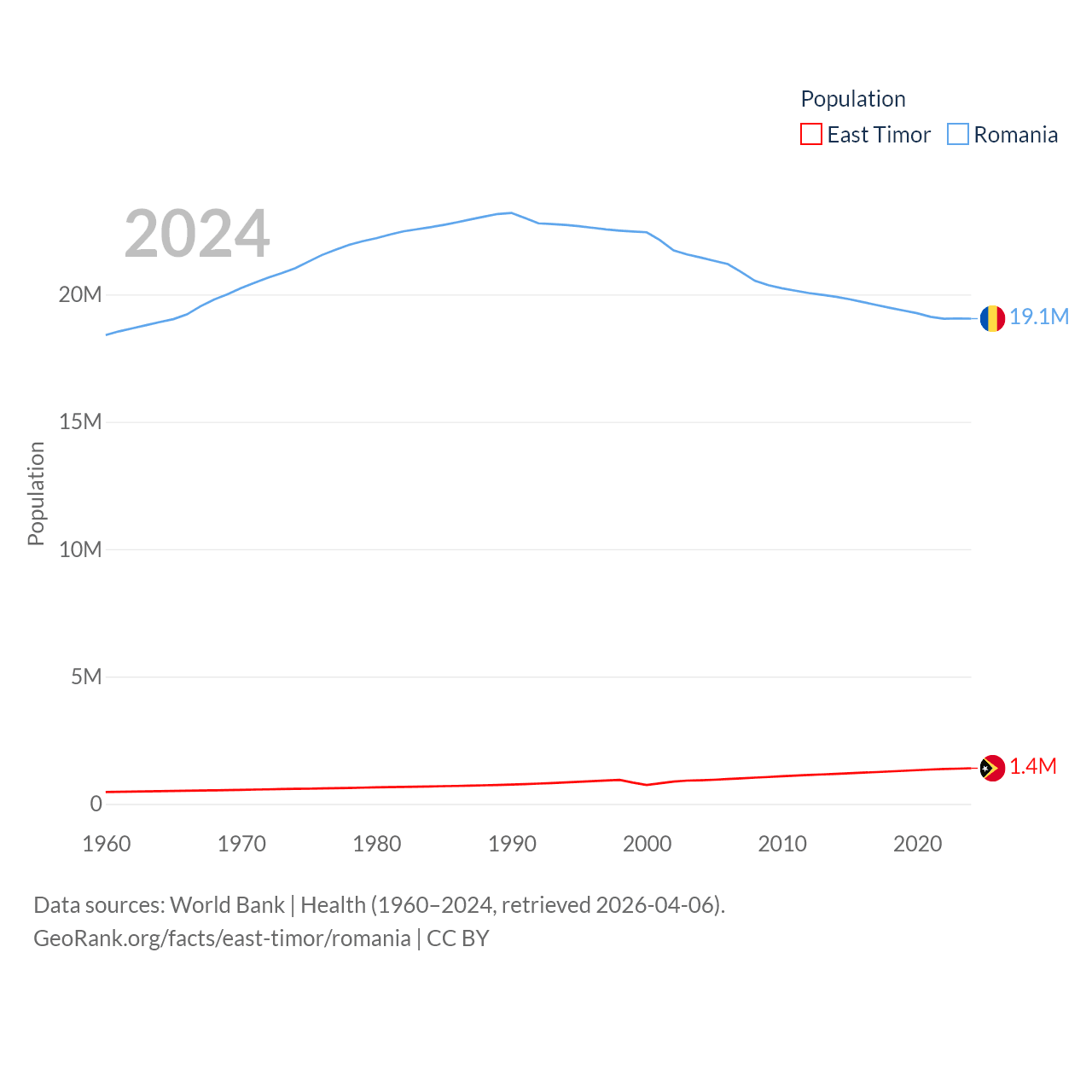 East Timor has a population of 1.4M (ranked 152/197), compared with 19.1M in Romania (ranked 67/197). East Timor's land area is 5,741 sq mi versus 88,834 sq mi for Romania (ranked 155th vs. 80th).