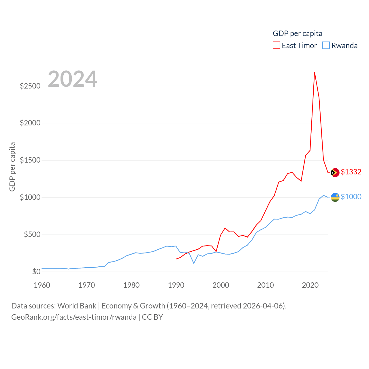 By GDP, East Timor ranks 181/197 ($1.87B) and Rwanda ranks 144/197 ($14.3B). By GDP per capita, East Timor ranks 167/197 ($1,332), while Rwanda ranks 178/197 ($1,000).