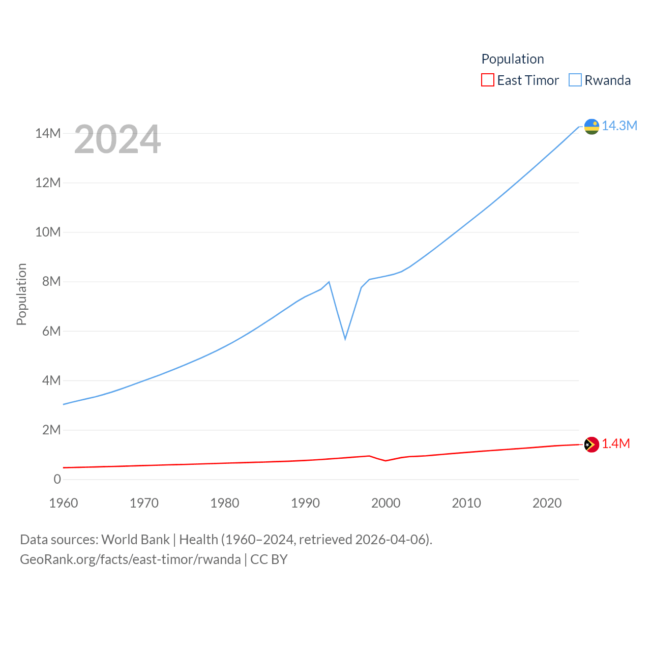 East Timor has a population of 1.4M (ranked 152/197), compared with 14.3M in Rwanda (ranked 77/197). East Timor's land area is 5,741 sq mi versus 9,525 sq mi for Rwanda (ranked 155th vs. 146th).