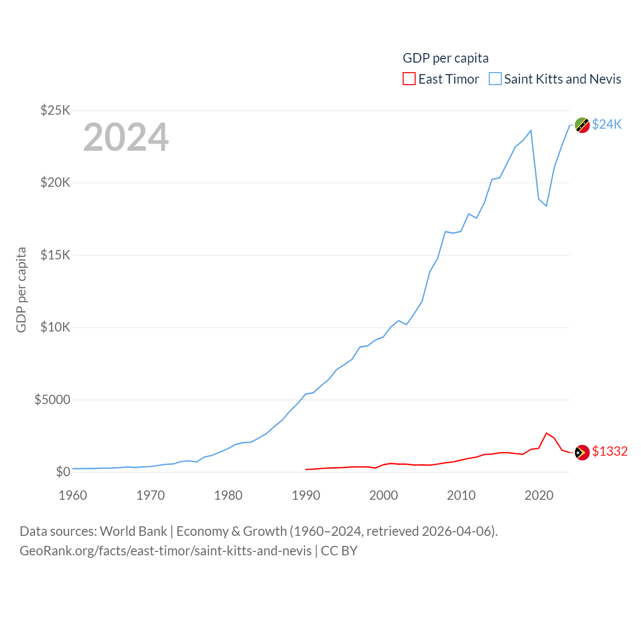 By GDP, East Timor ranks 181/197 ($1.87B) and Saint Kitts and Nevis ranks 187/197 ($1.12B). By GDP per capita, East Timor ranks 167/197 ($1,332), while Saint Kitts and Nevis ranks 51/197 ($23,961).
