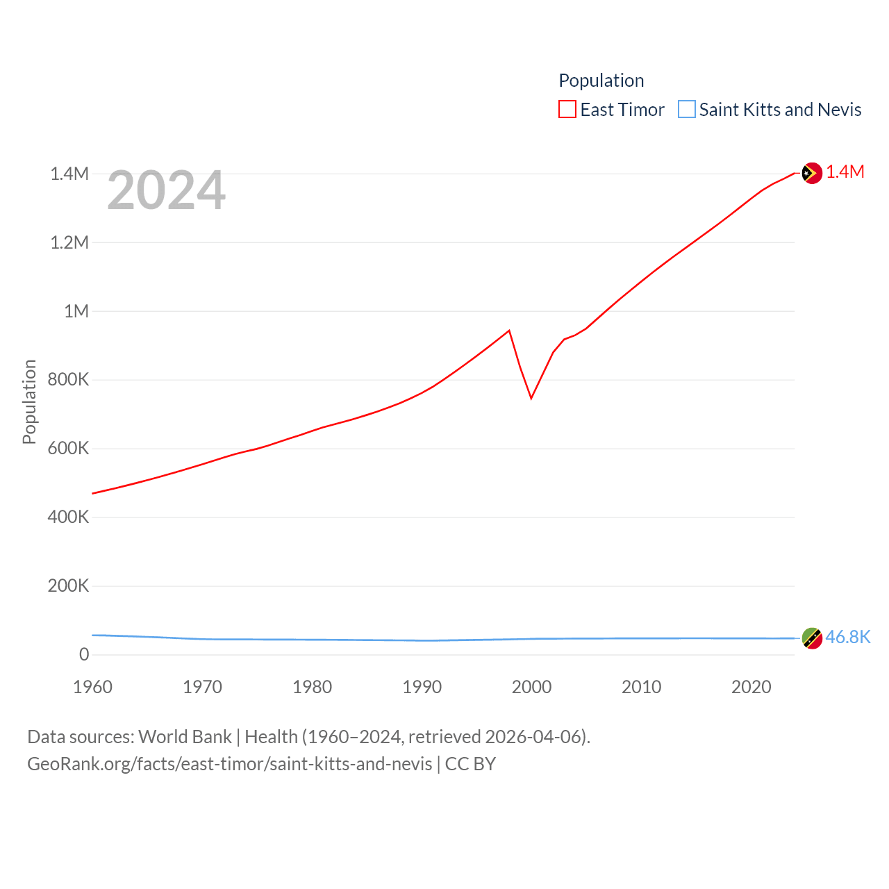 East Timor has a population of 1.4M (ranked 152/197), compared with 46.8K in Saint Kitts and Nevis (ranked 189/197). East Timor's land area is 5,741 sq mi versus 100.4 sq mi for Saint Kitts and Nevis (ranked 155th vs. 189th).