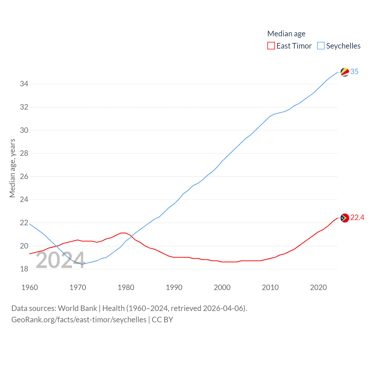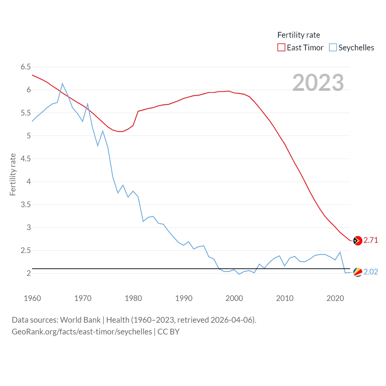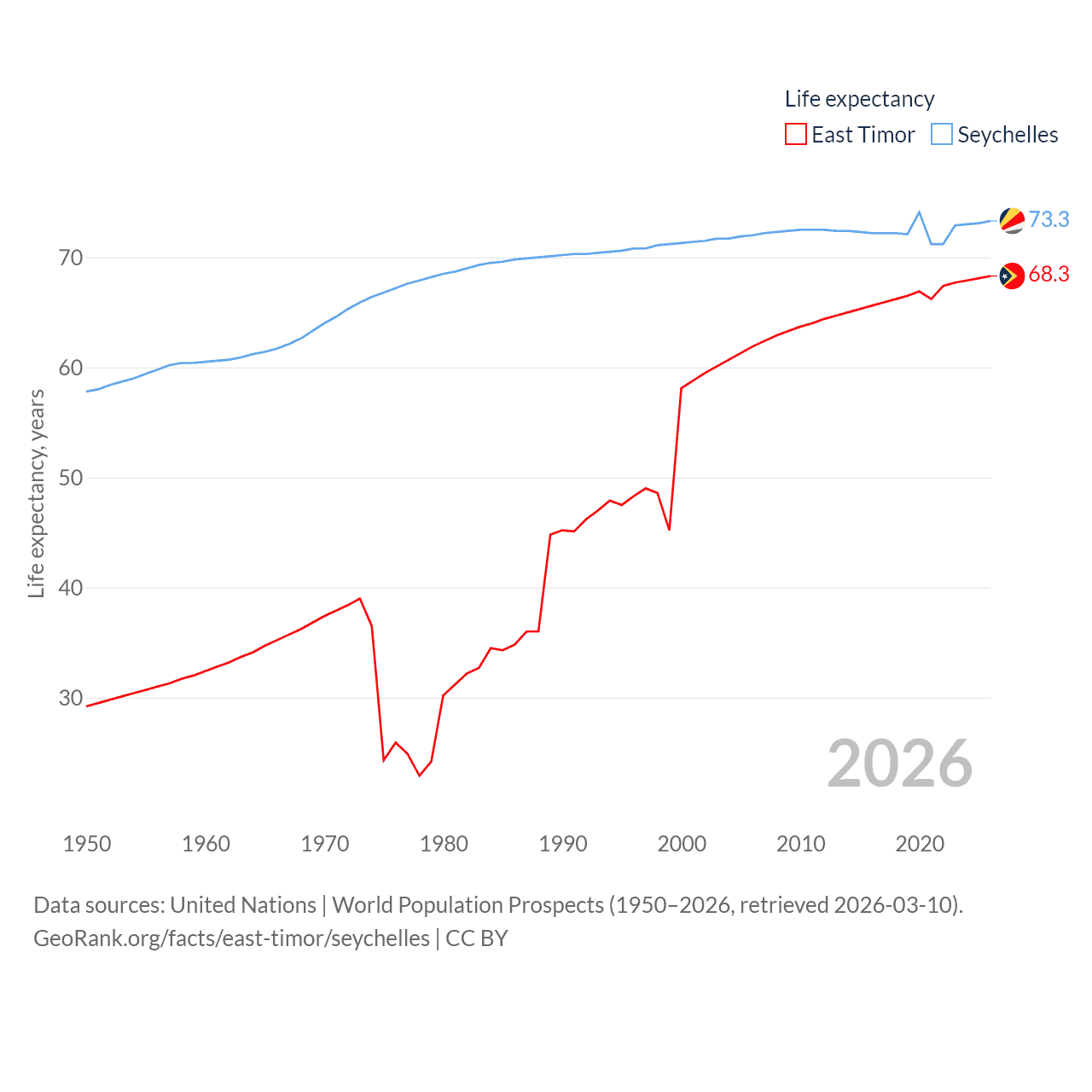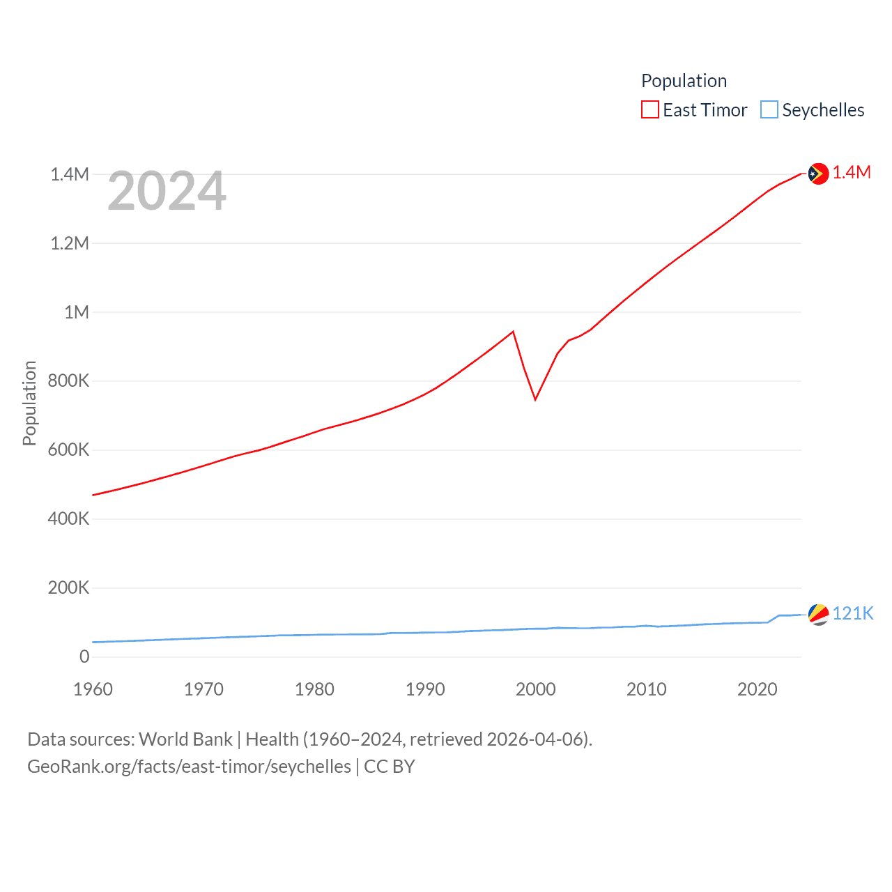 East Timor has a population of 1.4M (ranked 152/197), compared with 121K in The Seychelles (ranked 181/197). East Timor's land area is 5,741 sq mi versus 177.6 sq mi for The Seychelles (ranked 155th vs. 181st).