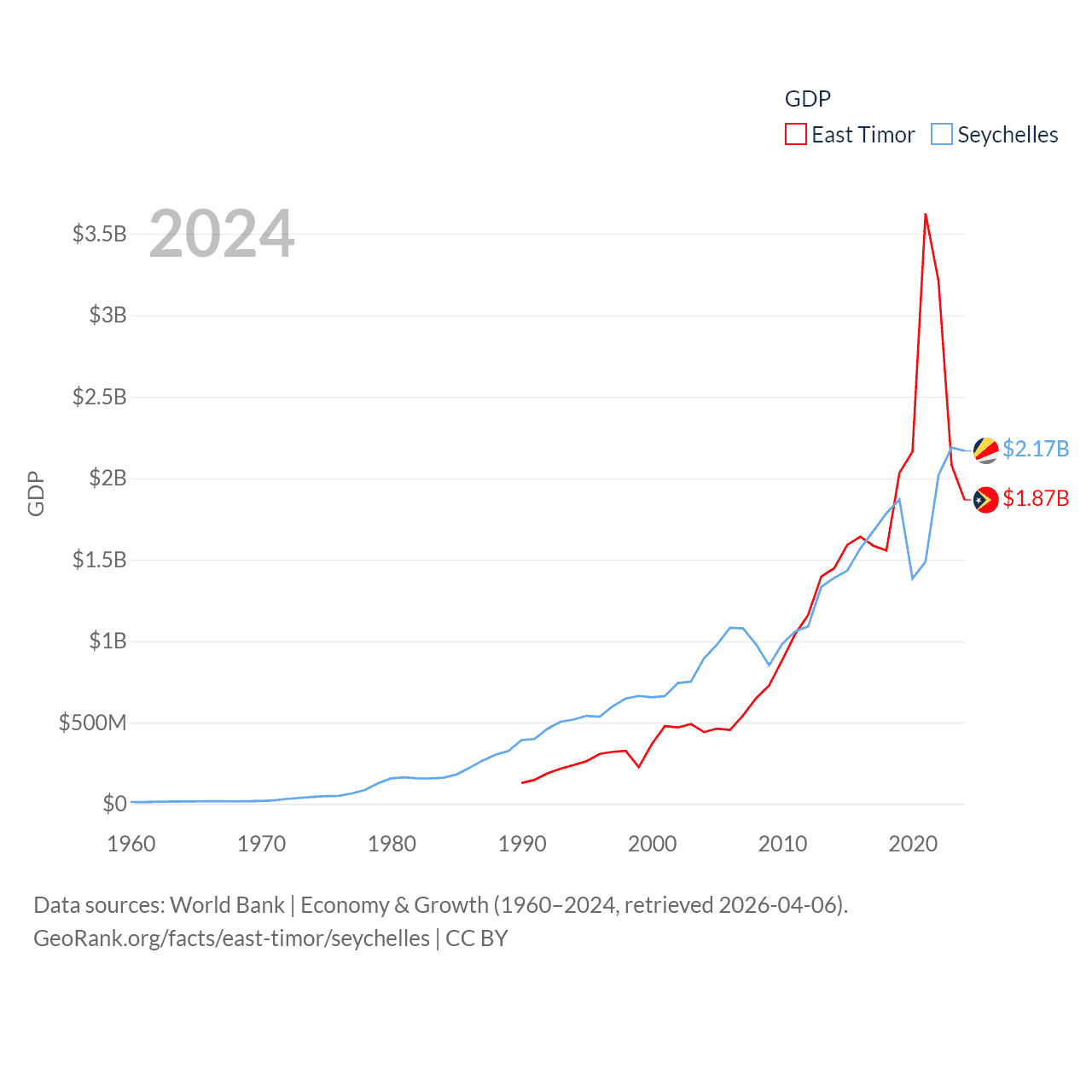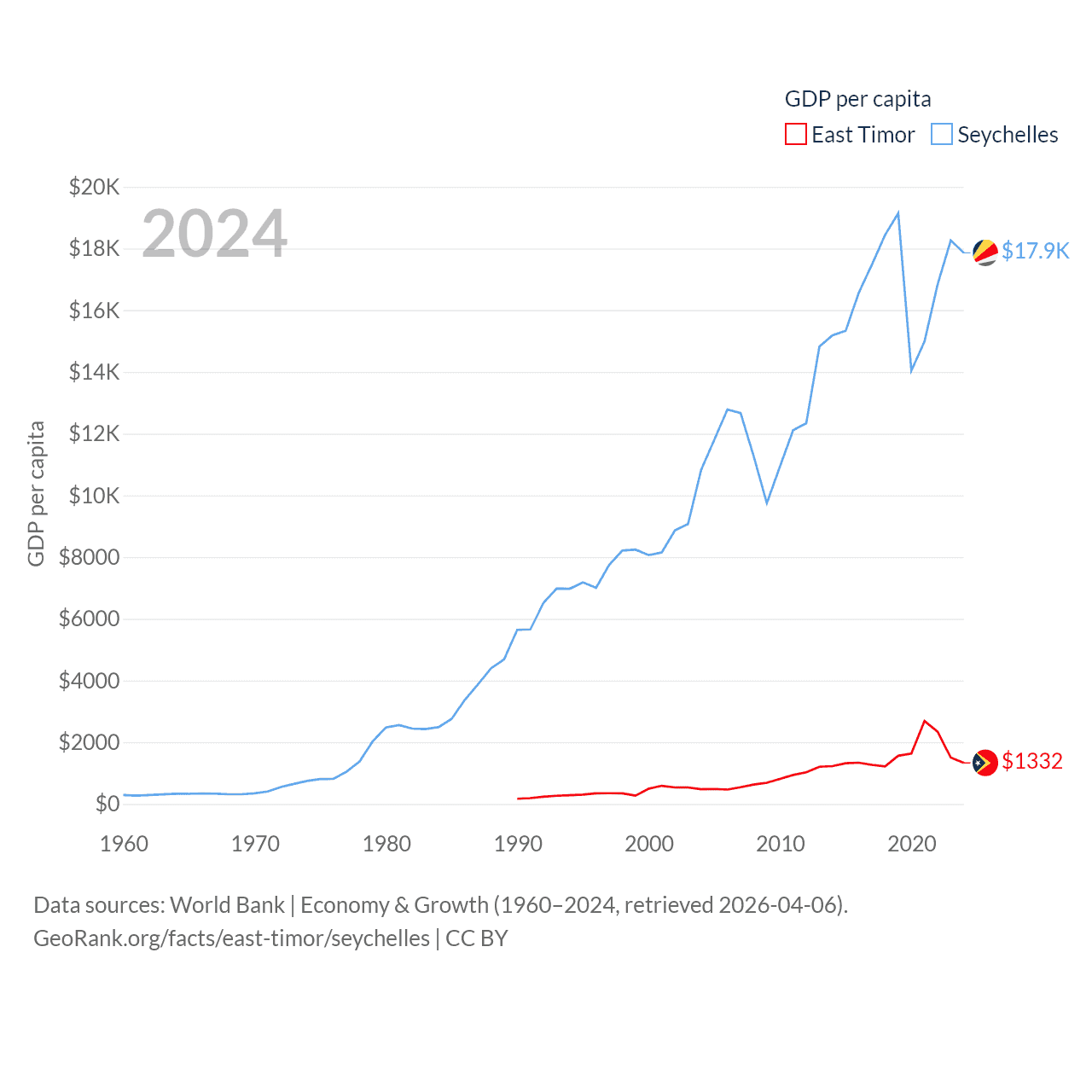By GDP, East Timor ranks 181/197 ($1.87B) and The Seychelles ranks 178/197 ($2.17B). By GDP per capita, East Timor ranks 167/197 ($1,332), while The Seychelles ranks 63/197 ($17,859).