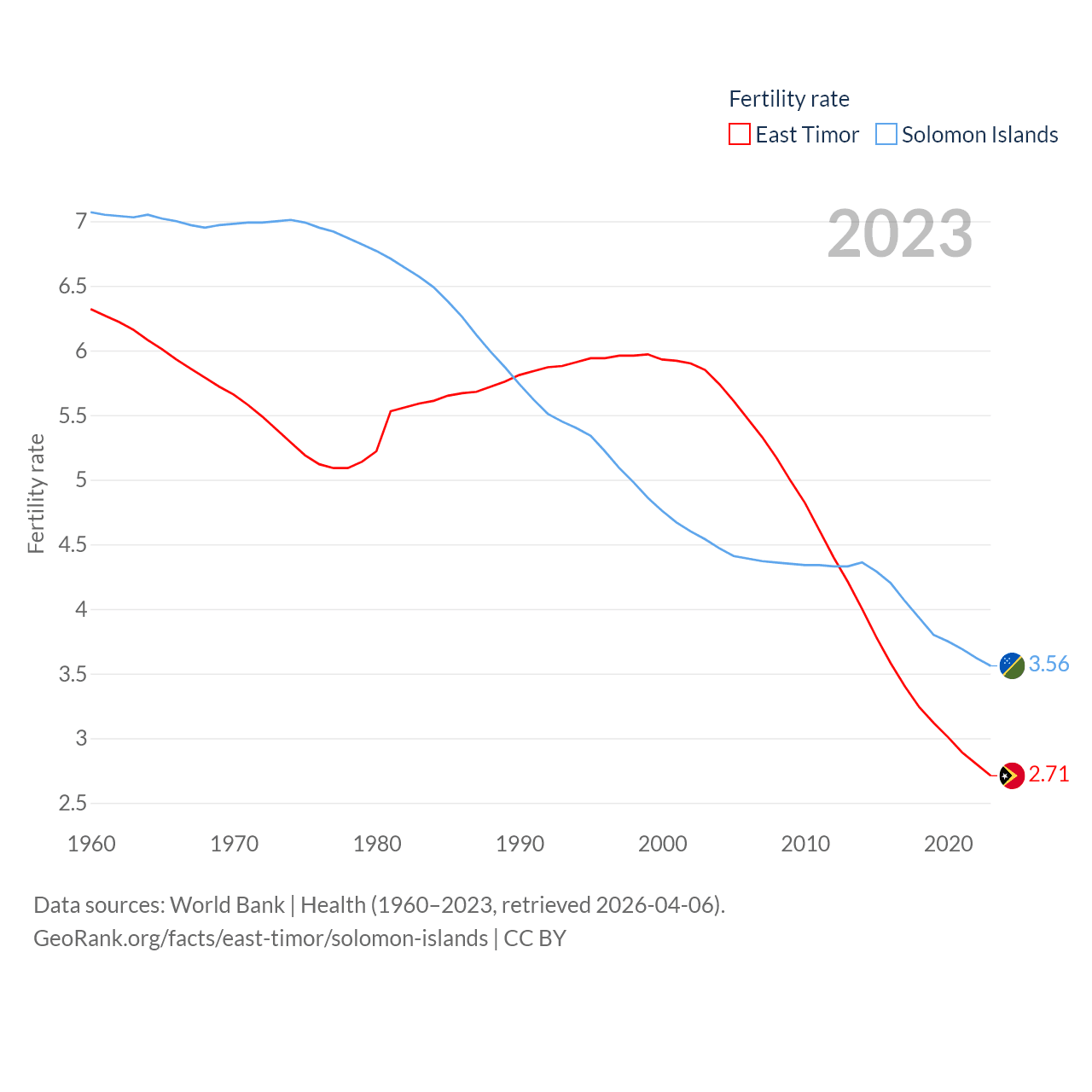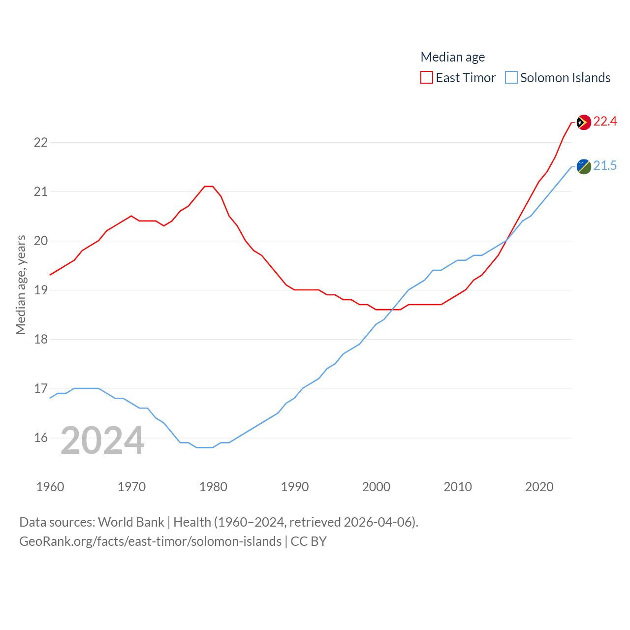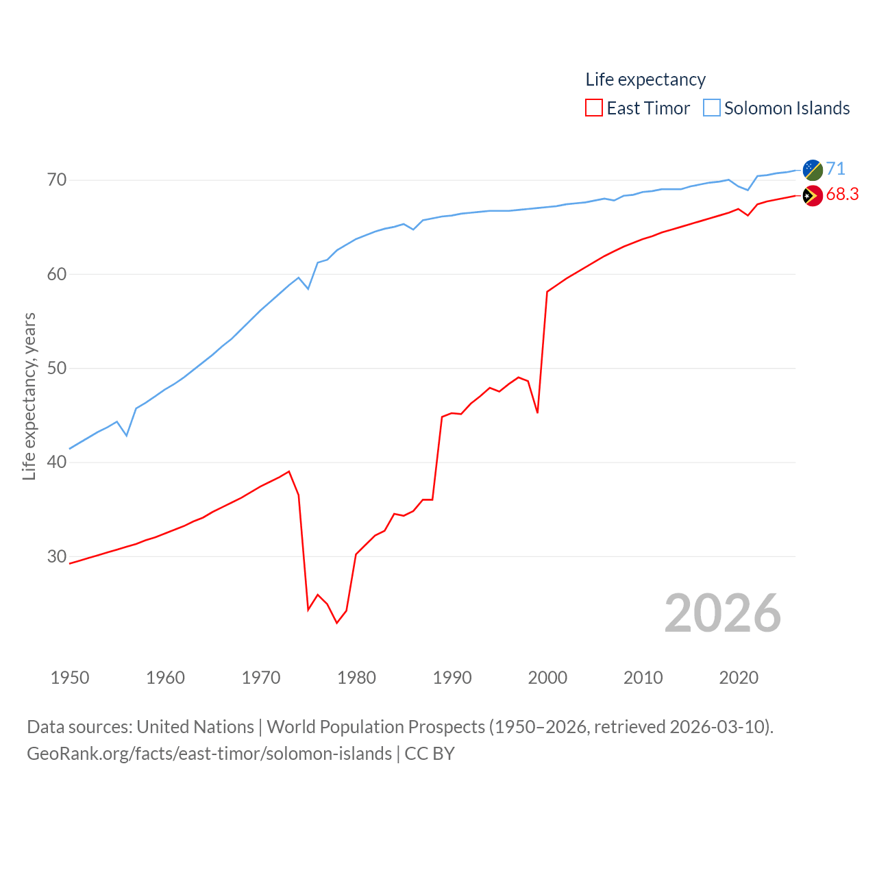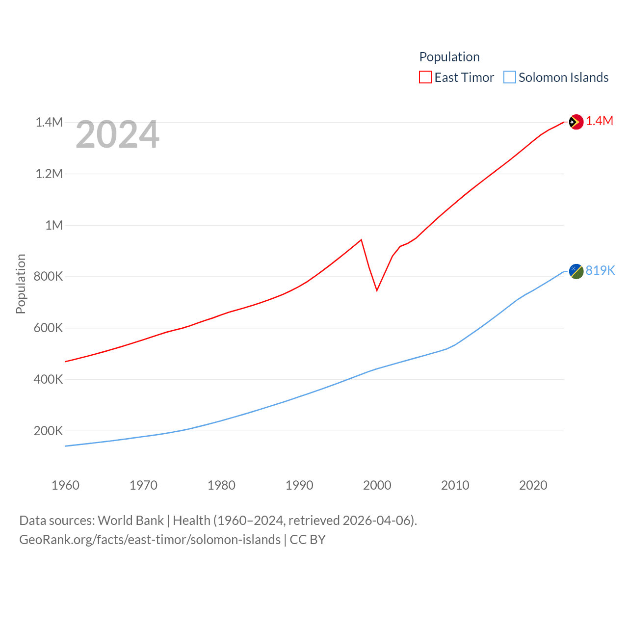 East Timor has a population of 1.4M (ranked 152/197), compared with 819K in The Solomon Islands (ranked 162/197). East Timor's land area is 5,741 sq mi versus 10,807 sq mi for The Solomon Islands (ranked 155th vs. 141st).