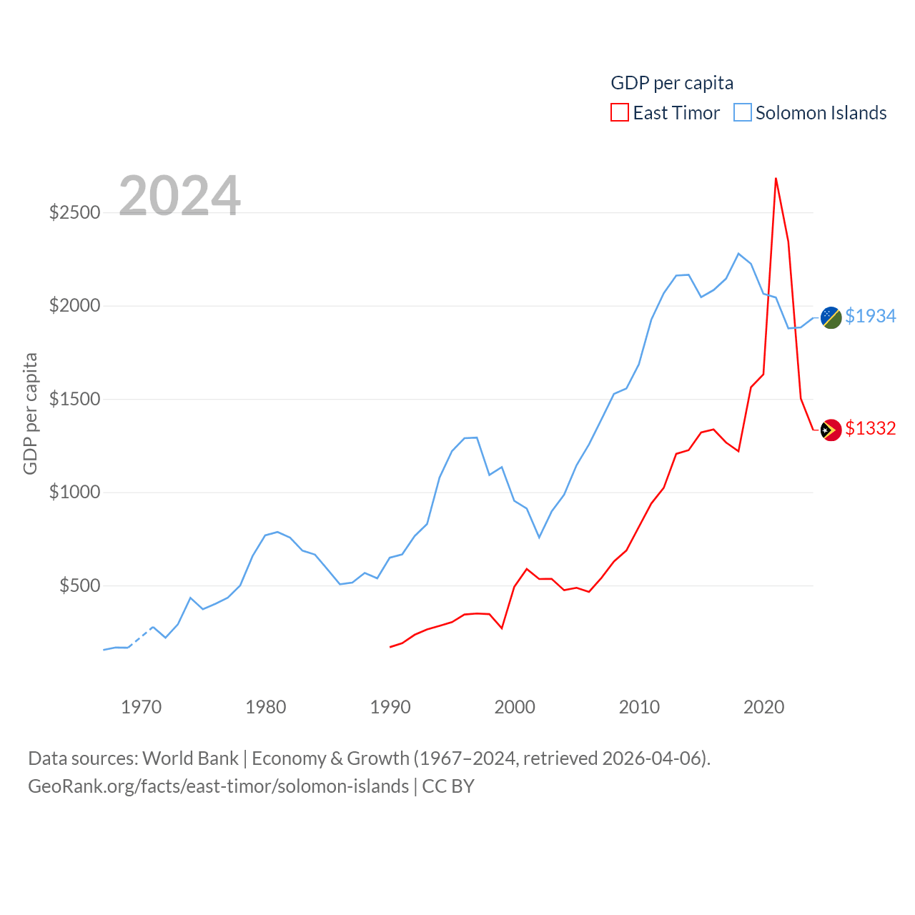 By GDP, East Timor ranks 181/197 ($1.87B) and The Solomon Islands ranks 182/197 ($1.58B). By GDP per capita, East Timor ranks 167/197 ($1,332), while The Solomon Islands ranks 157/197 ($1,934).