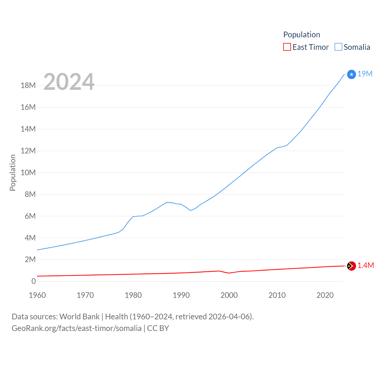 East Timor has a population of 1.4M (ranked 152/197), compared with 19M in Somalia (ranked 68/197). East Timor's land area is 5,741 sq mi versus 242,217 sq mi for Somalia (ranked 155th vs. 42nd).