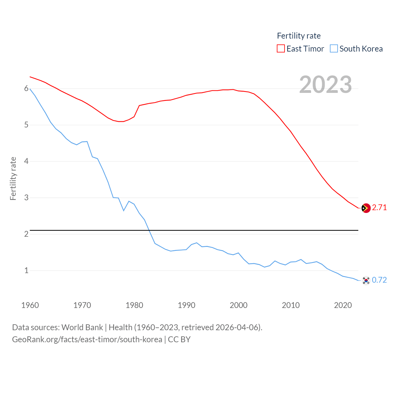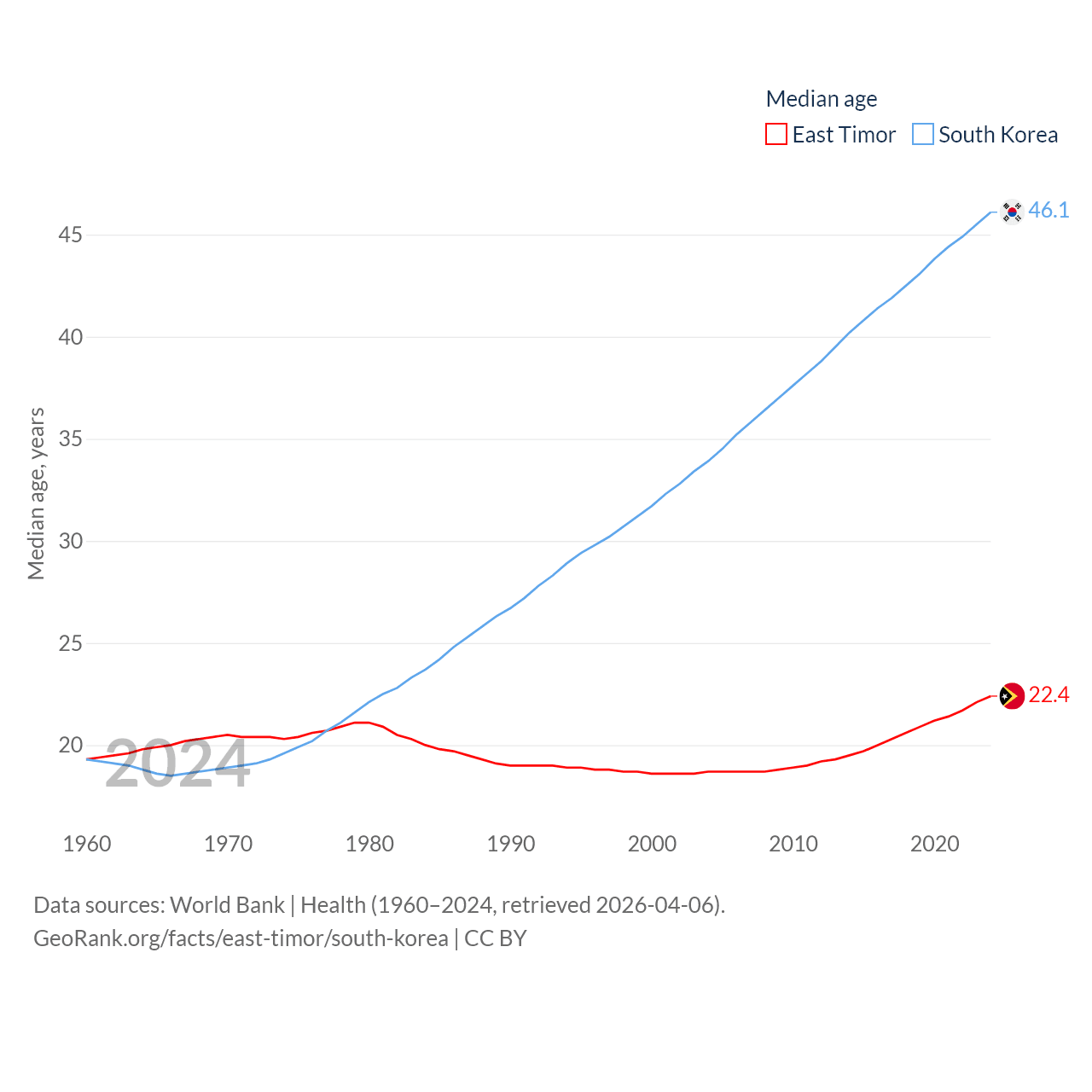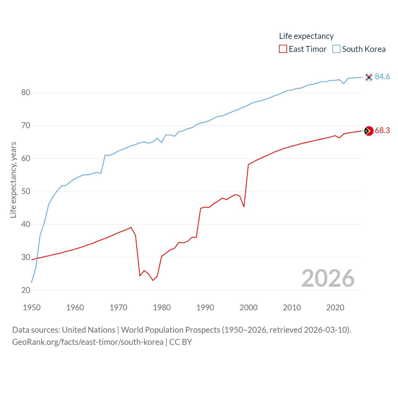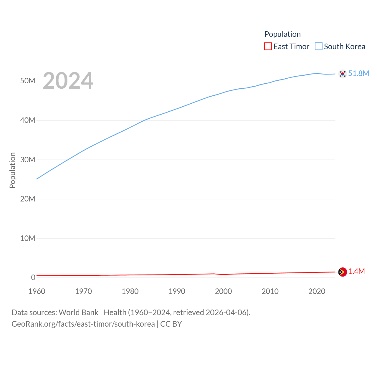 East Timor has a population of 1.4M (ranked 152/197), compared with 51.8M in South Korea (ranked 29/197). East Timor's land area is 5,741 sq mi versus 37,684 sq mi for South Korea (ranked 155th vs. 105th).