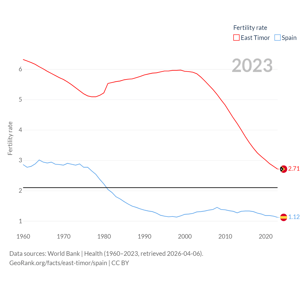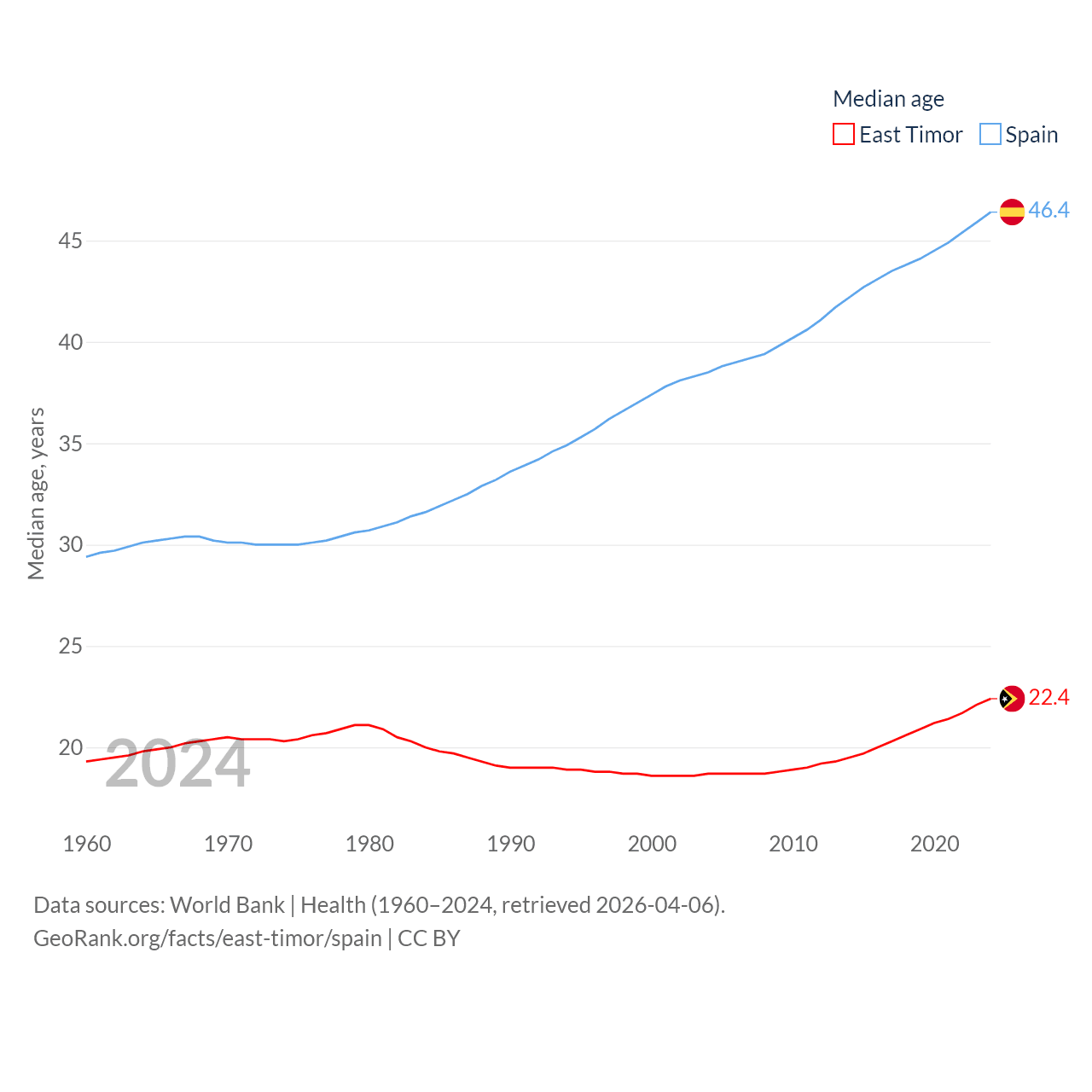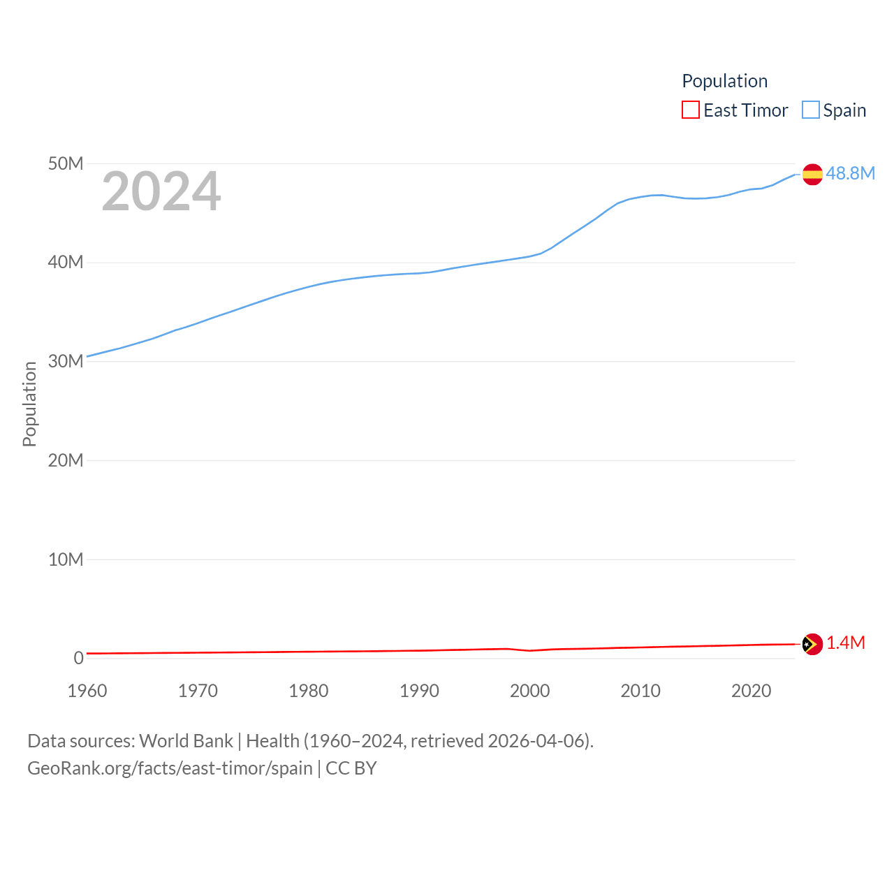 East Timor has a population of 1.4M (ranked 152/197), compared with 48.8M in Spain (ranked 32/197). East Timor's land area is 5,741 sq mi versus 192,934 sq mi for Spain (ranked 155th vs. 51st).