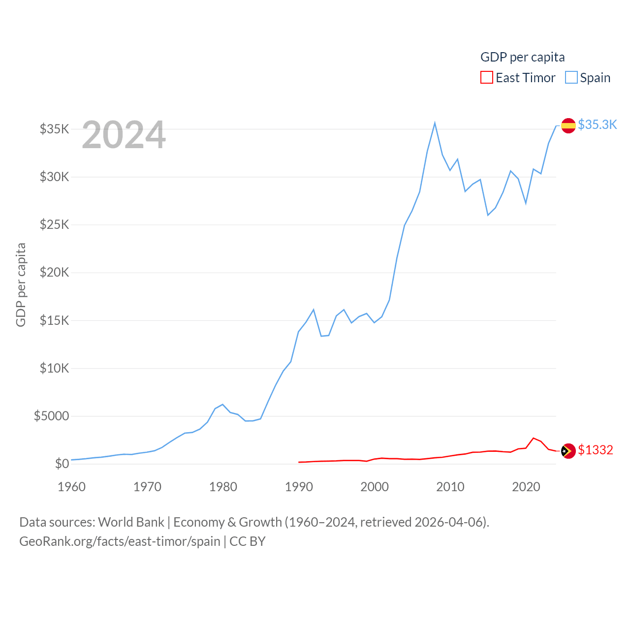 By GDP, East Timor ranks 181/197 ($1.87B) and Spain ranks 15/197 ($1.73T). By GDP per capita, East Timor ranks 167/197 ($1,332), while Spain ranks 32/197 ($35,327).