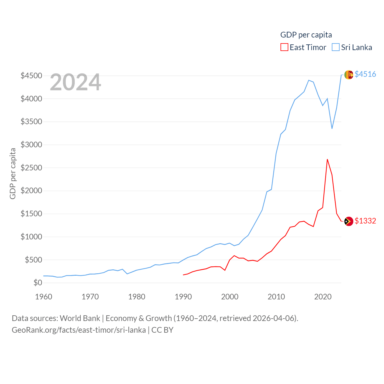 By GDP, East Timor ranks 181/197 ($1.87B) and Sri Lanka ranks 72/197 ($99B). By GDP per capita, East Timor ranks 167/197 ($1,332), while Sri Lanka ranks 124/197 ($4,516).