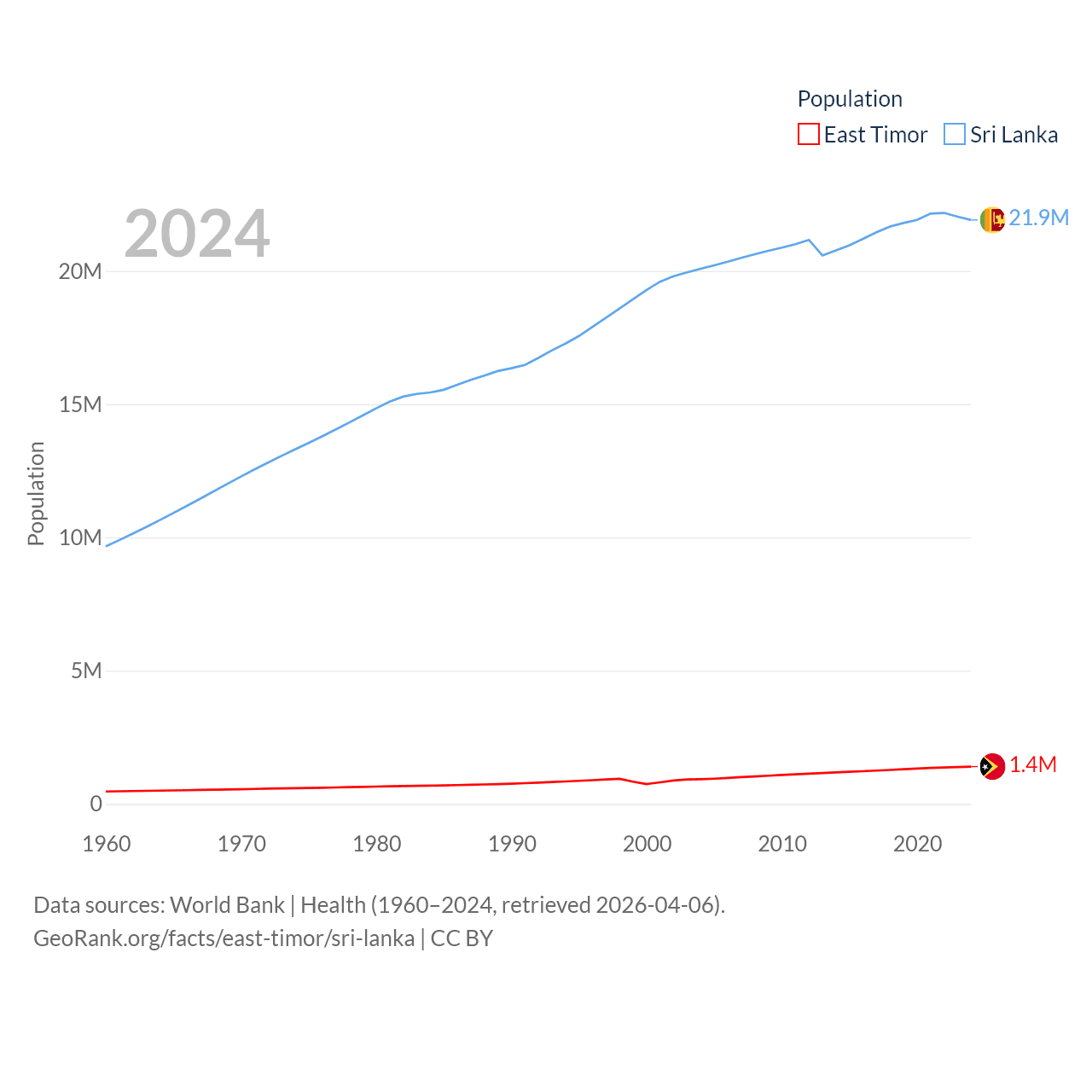 East Timor has a population of 1.4M (ranked 152/197), compared with 21.9M in Sri Lanka (ranked 61/197). East Timor's land area is 5,741 sq mi versus 23,884 sq mi for Sri Lanka (ranked 155th vs. 122nd).