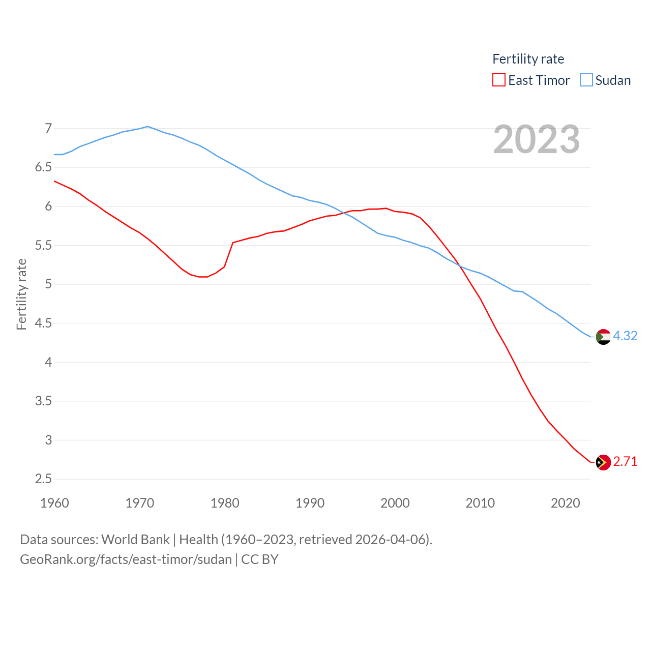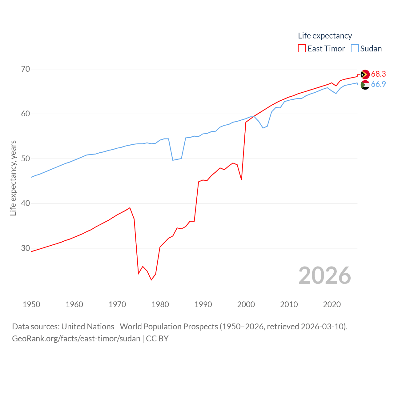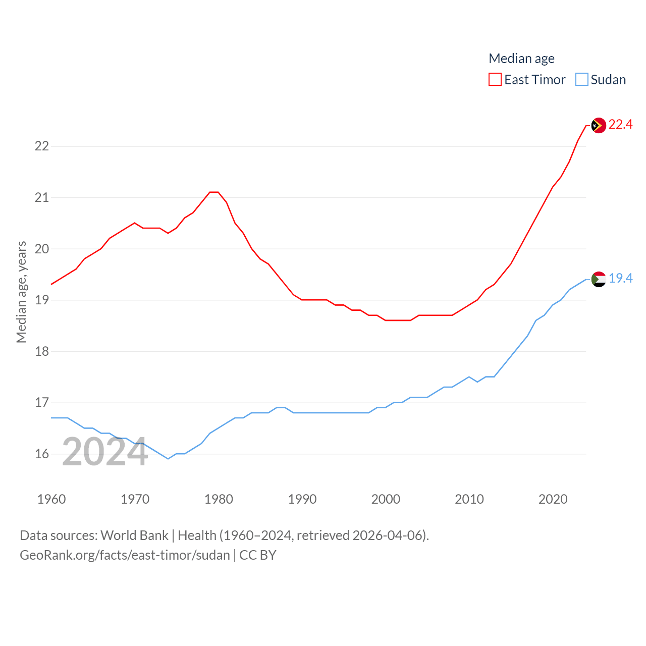 East Timor has a population of 1.4M (ranked 152/197), compared with 50.4M in Sudan (ranked 30/197). East Timor's land area is 5,741 sq mi versus 721,239 sq mi for Sudan (ranked 155th vs. 15th).