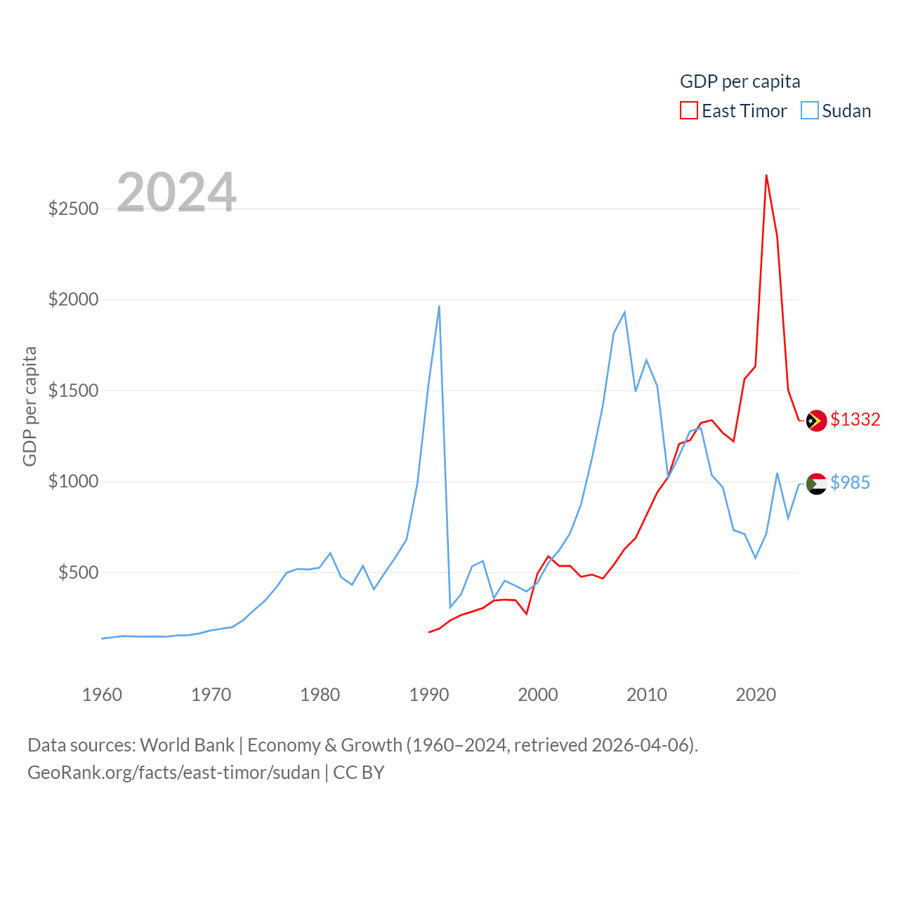 By GDP, East Timor ranks 181/197 ($1.87B) and Sudan ranks 94/197 ($49.7B). By GDP per capita, East Timor ranks 167/197 ($1,332), while Sudan ranks 179/197 ($985).
