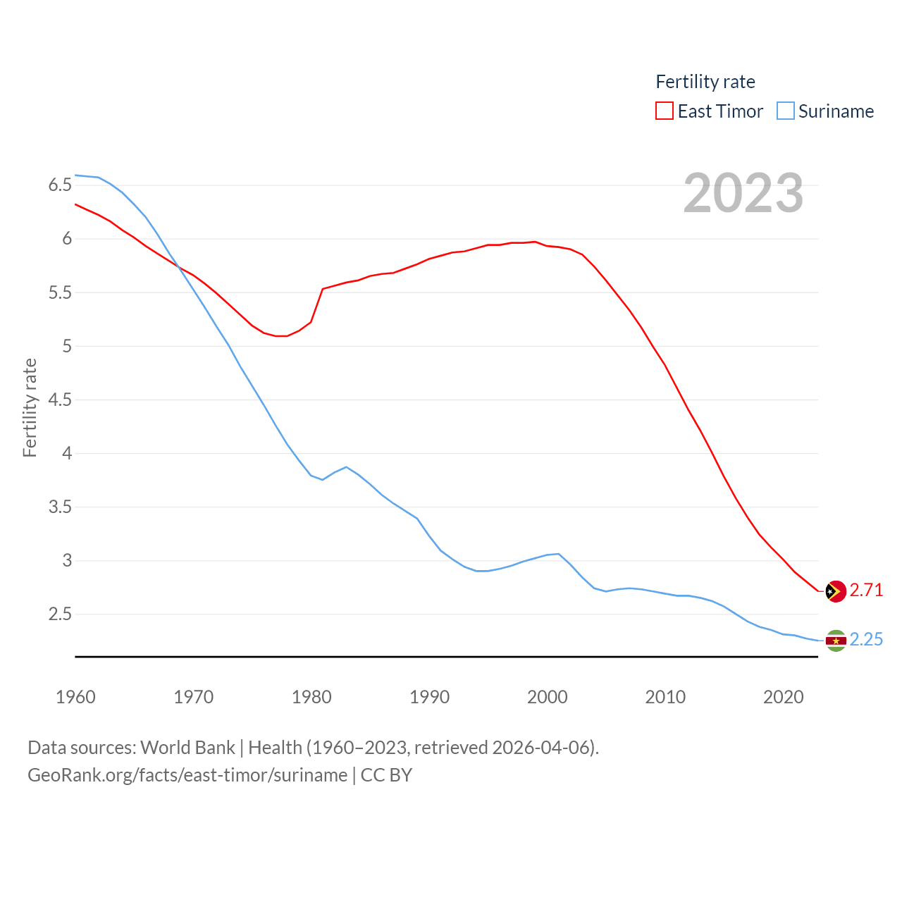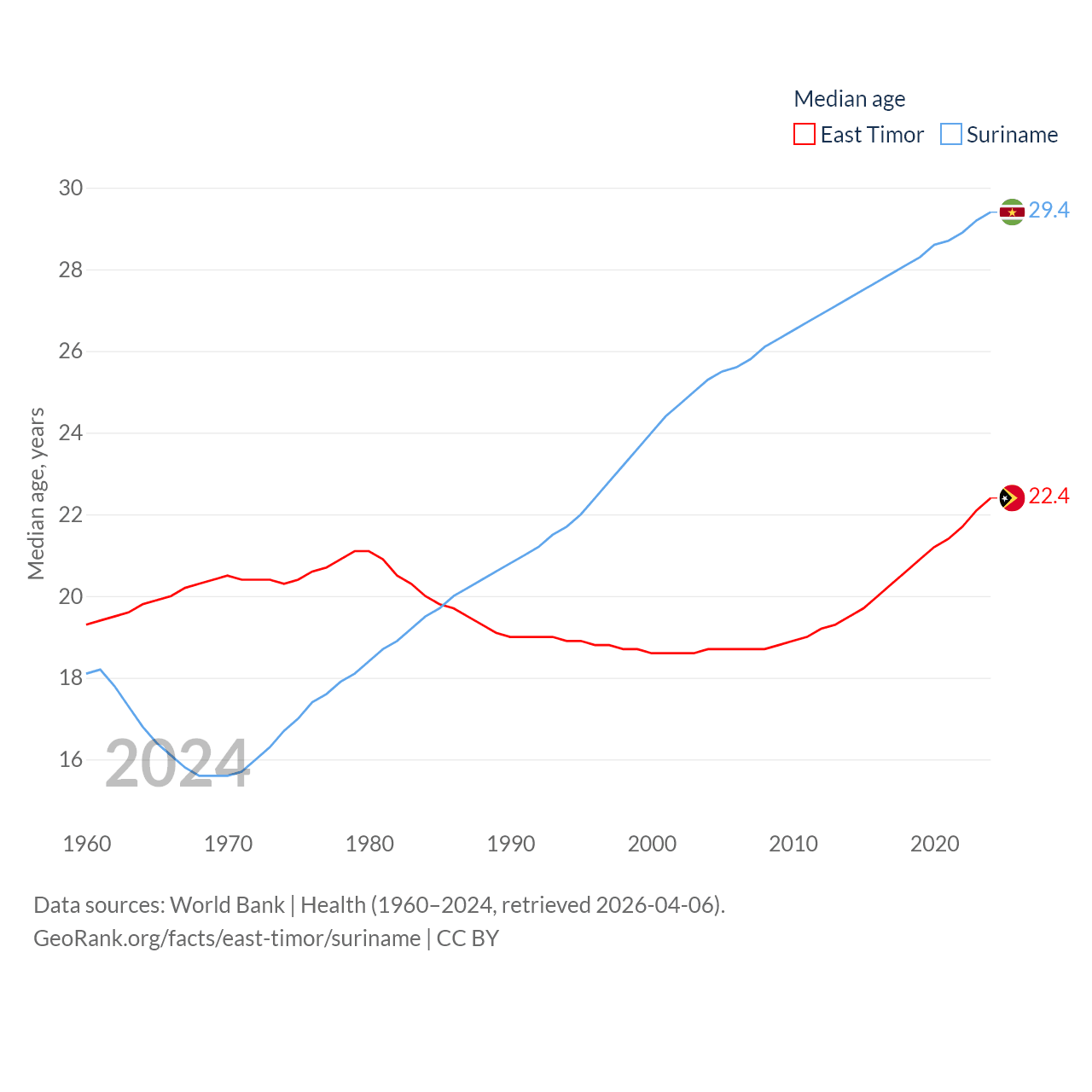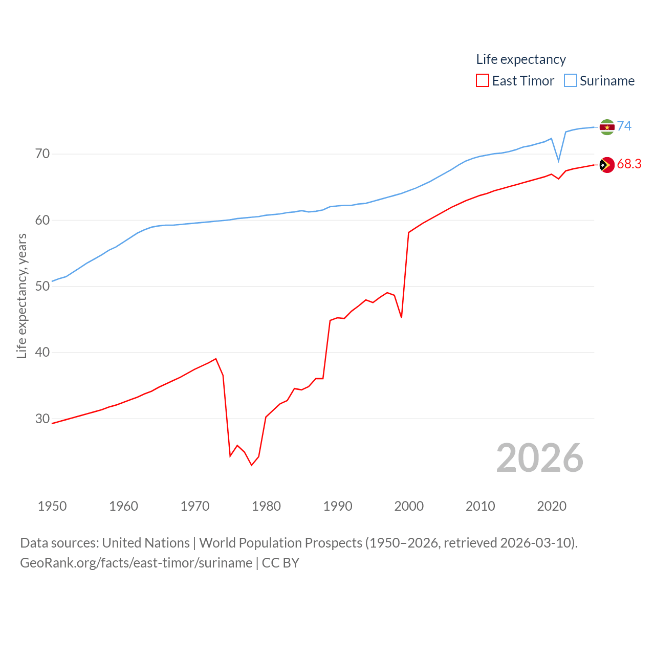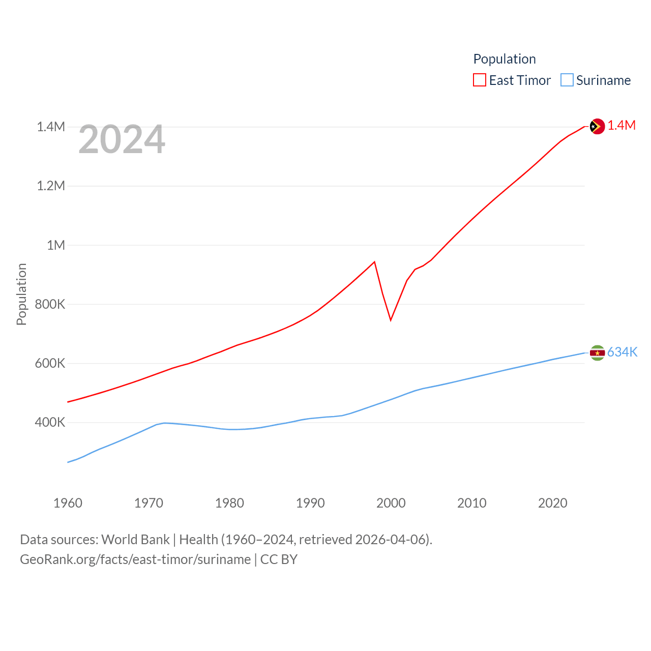 East Timor has a population of 1.4M (ranked 152/197), compared with 634K in Suriname (ranked 165/197). East Timor's land area is 5,741 sq mi versus 61,972 sq mi for Suriname (ranked 155th vs. 90th).