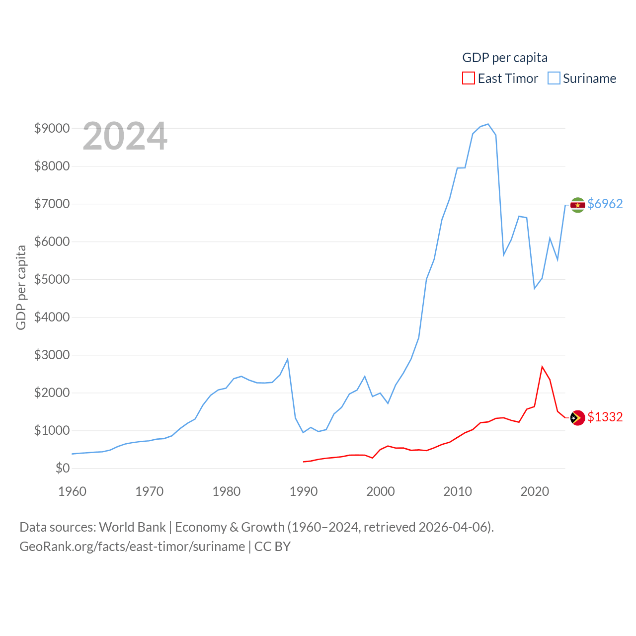 By GDP, East Timor ranks 181/197 ($1.87B) and Suriname ranks 164/197 ($4.42B). By GDP per capita, East Timor ranks 167/197 ($1,332), while Suriname ranks 102/197 ($6,962).