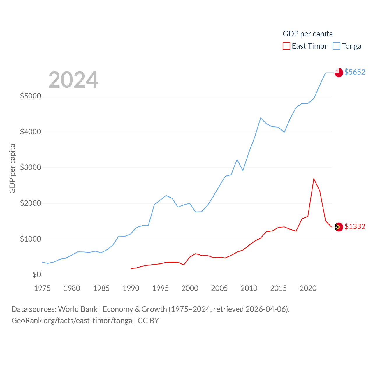 By GDP, East Timor ranks 181/197 ($1.87B) and Tonga ranks 191/197 ($591M). By GDP per capita, East Timor ranks 167/197 ($1,332), while Tonga ranks 115/197 ($5,652).