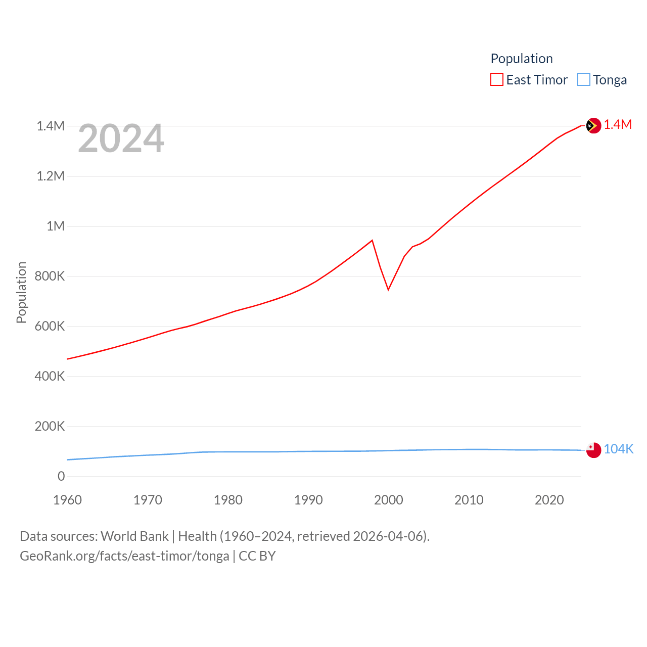 East Timor has a population of 1.4M (ranked 152/197), compared with 104K in Tonga (ranked 183/197). East Timor's land area is 5,741 sq mi versus 278 sq mi for Tonga (ranked 155th vs. 176th).