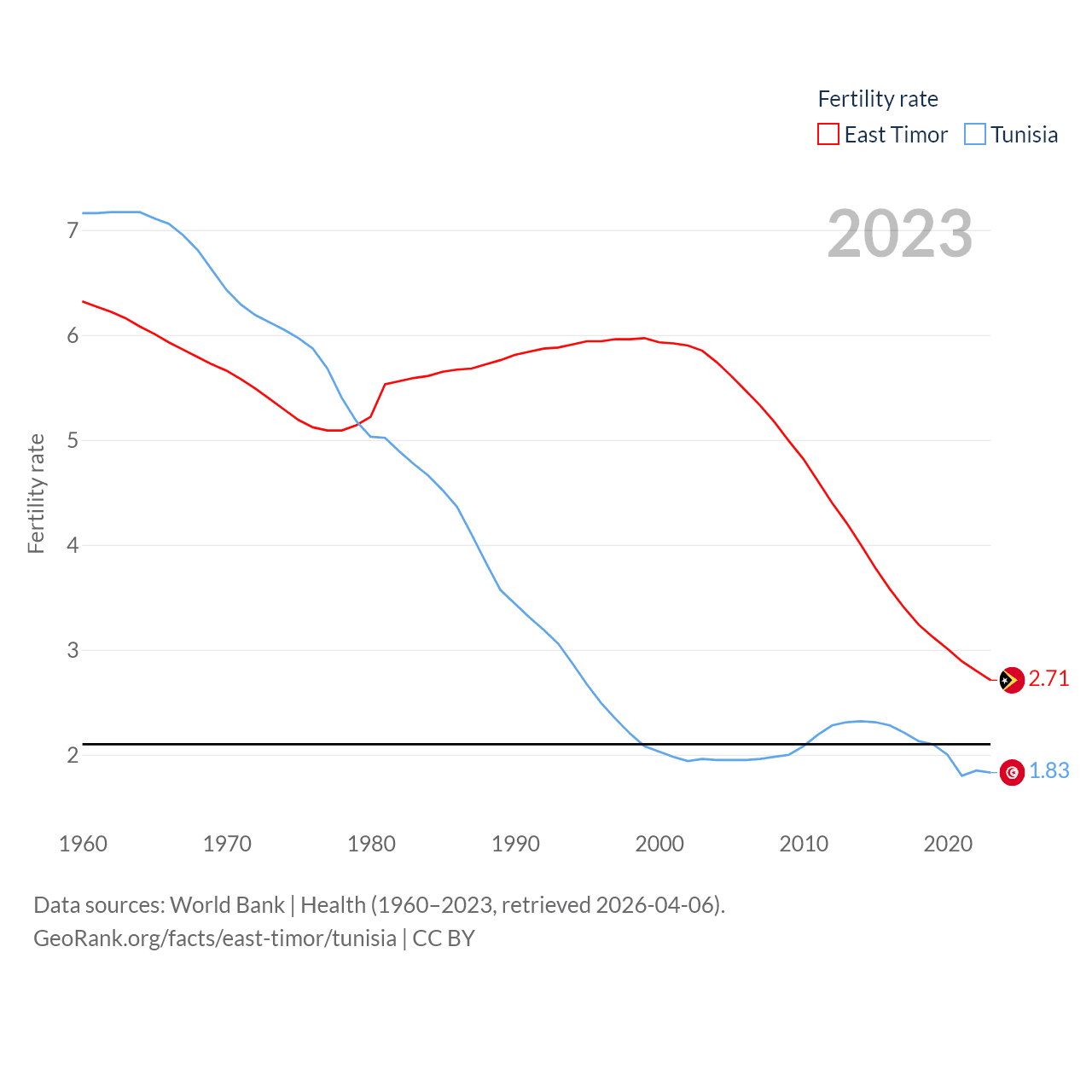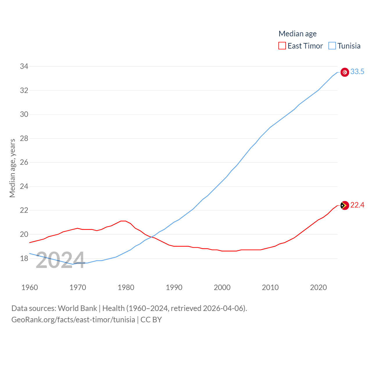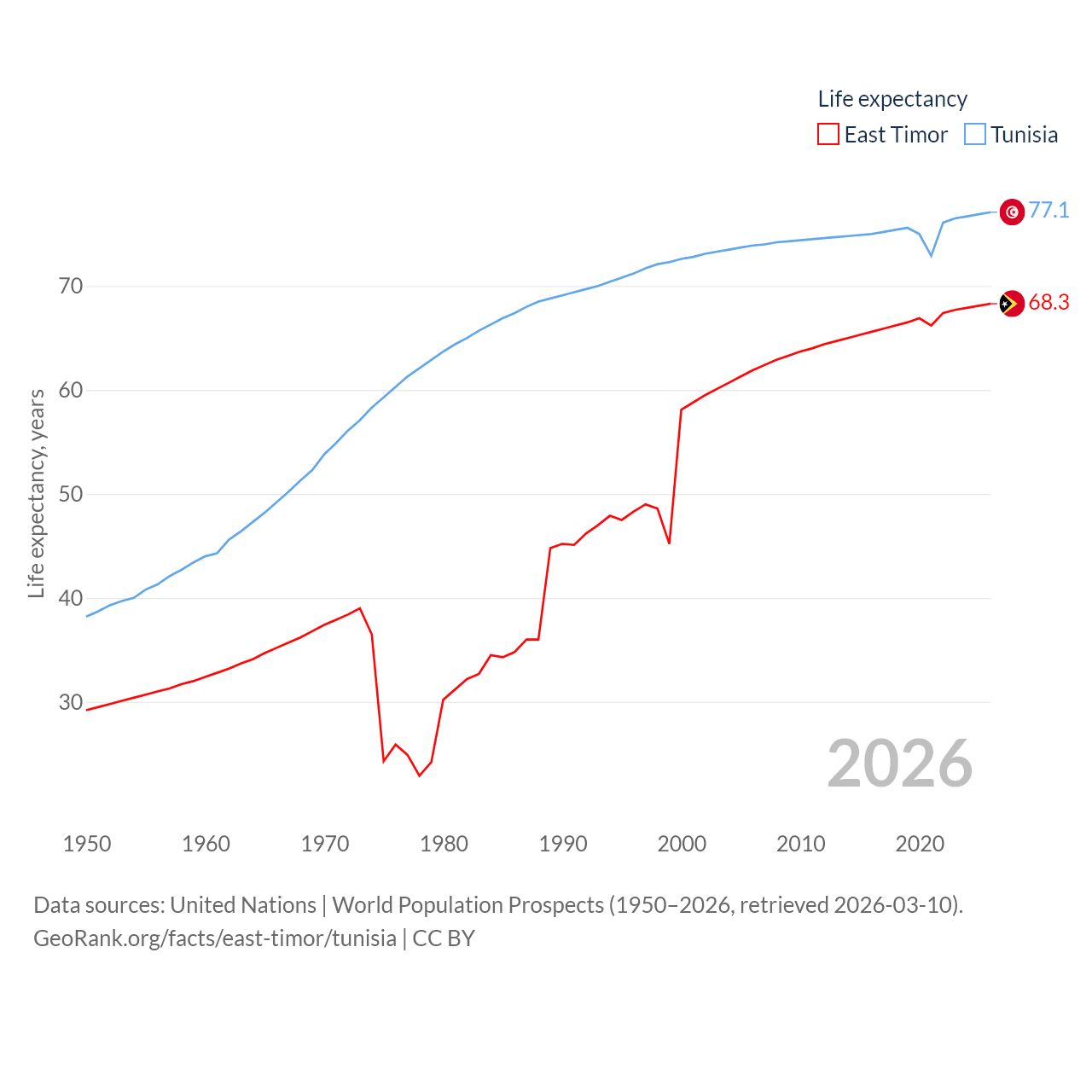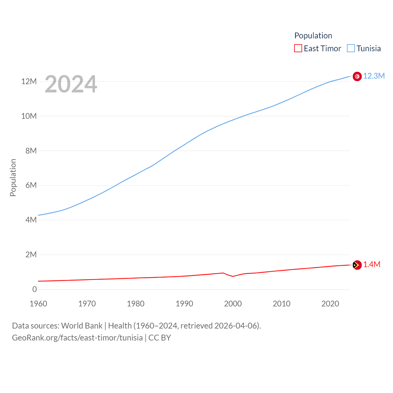 East Timor has a population of 1.4M (ranked 152/197), compared with 12.3M in Tunisia (ranked 80/197). East Timor's land area is 5,741 sq mi versus 59,985 sq mi for Tunisia (ranked 155th vs. 91st).