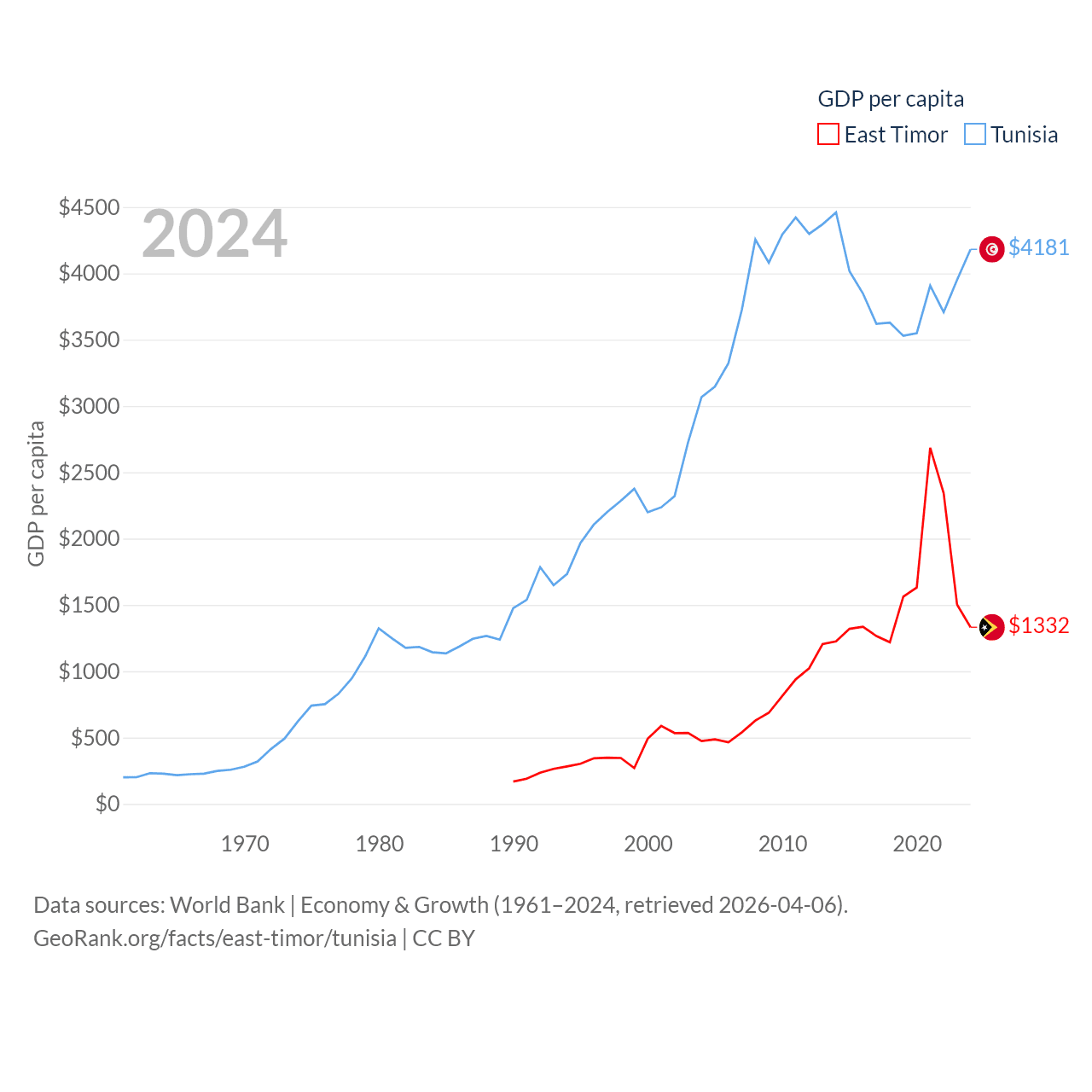 By GDP, East Timor ranks 181/197 ($1.87B) and Tunisia ranks 93/197 ($51.3B). By GDP per capita, East Timor ranks 167/197 ($1,332), while Tunisia ranks 129/197 ($4,181).