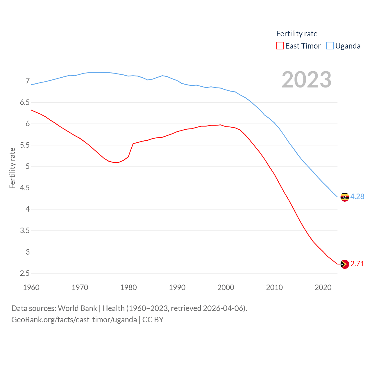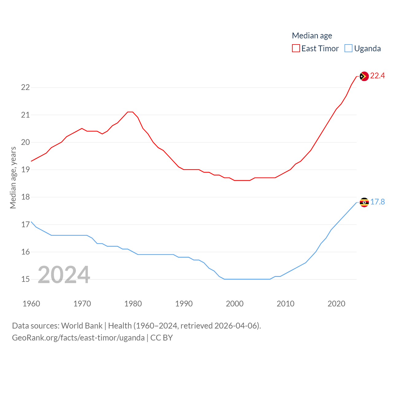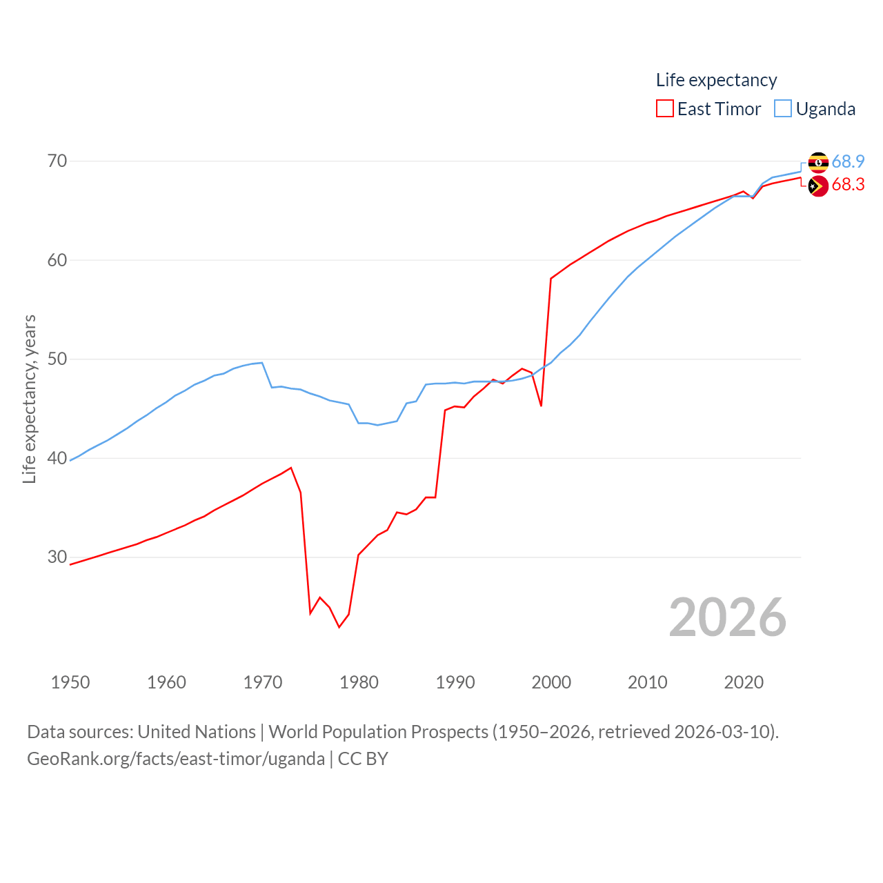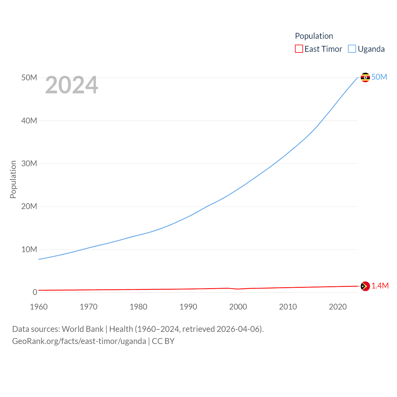 East Timor has a population of 1.4M (ranked 152/197), compared with 50M in Uganda (ranked 31/197). East Timor's land area is 5,741 sq mi versus 77,421 sq mi for Uganda (ranked 155th vs. 84th).