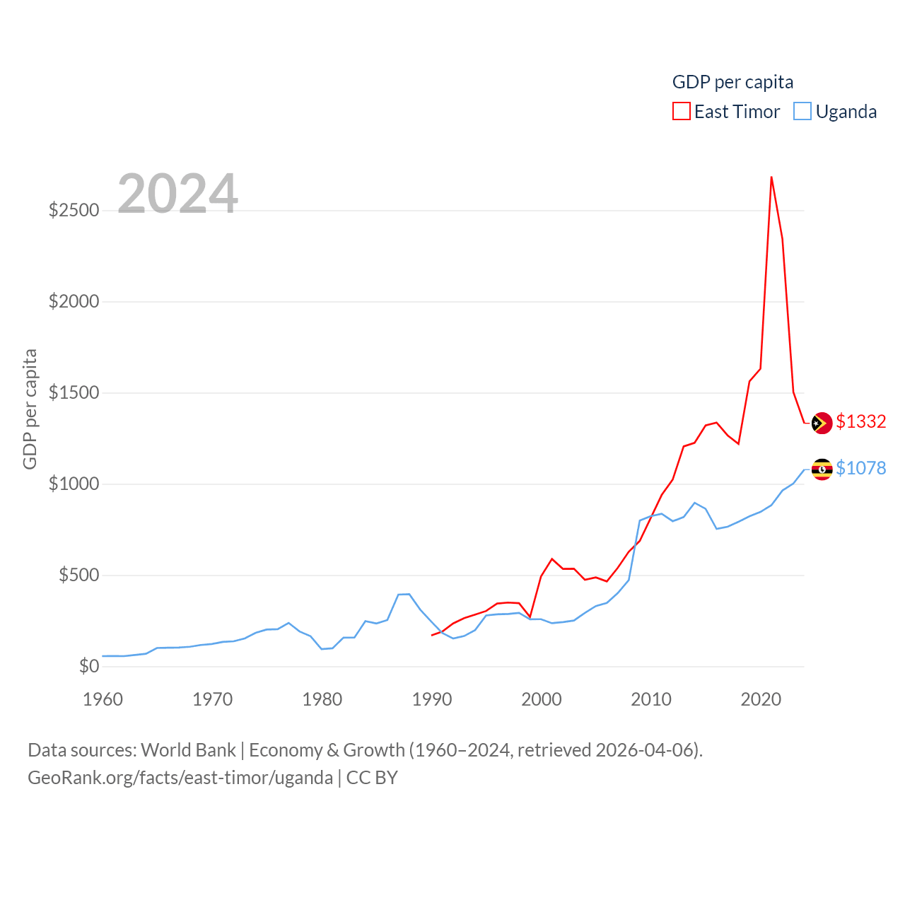 By GDP, East Timor ranks 181/197 ($1.87B) and Uganda ranks 89/197 ($53.9B). By GDP per capita, East Timor ranks 167/197 ($1,332), while Uganda ranks 176/197 ($1,078).
