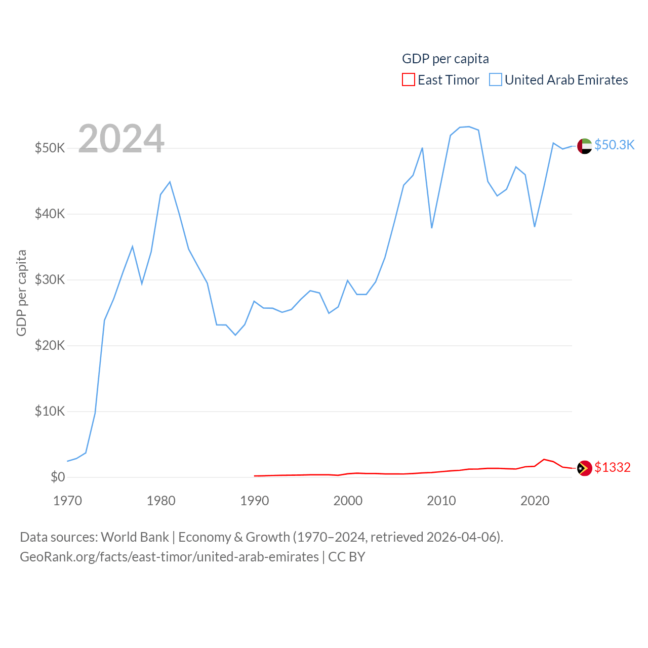 By GDP, East Timor ranks 181/197 ($1.87B) and The United Arab Emirates ranks 27/197 ($552B). By GDP per capita, East Timor ranks 167/197 ($1,332), while The United Arab Emirates ranks 24/197 ($50,274).
