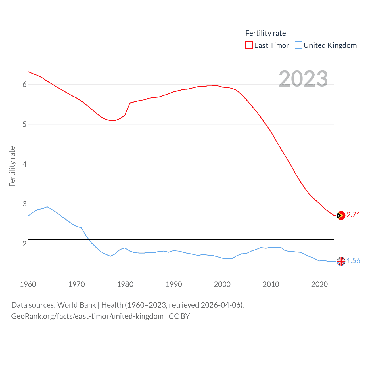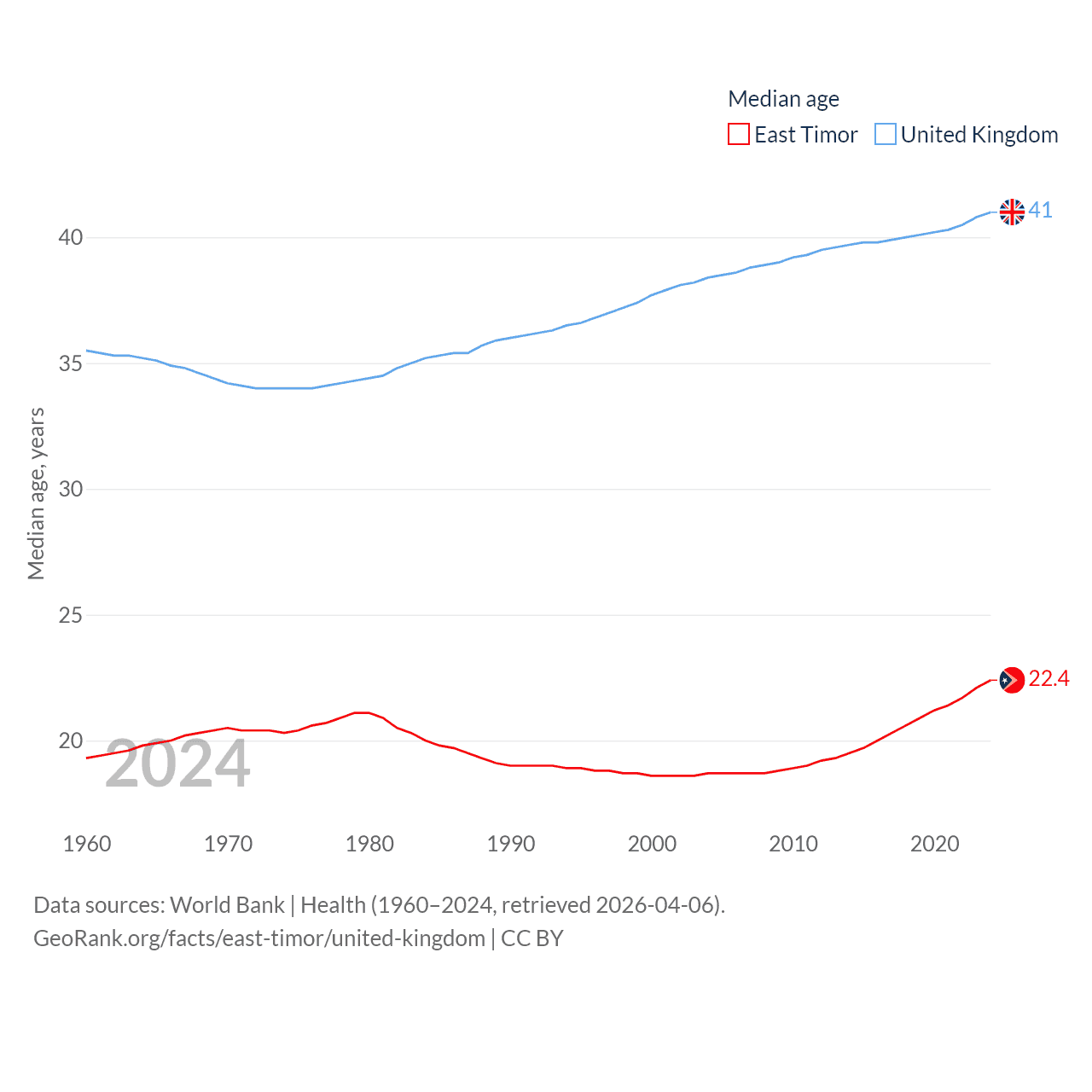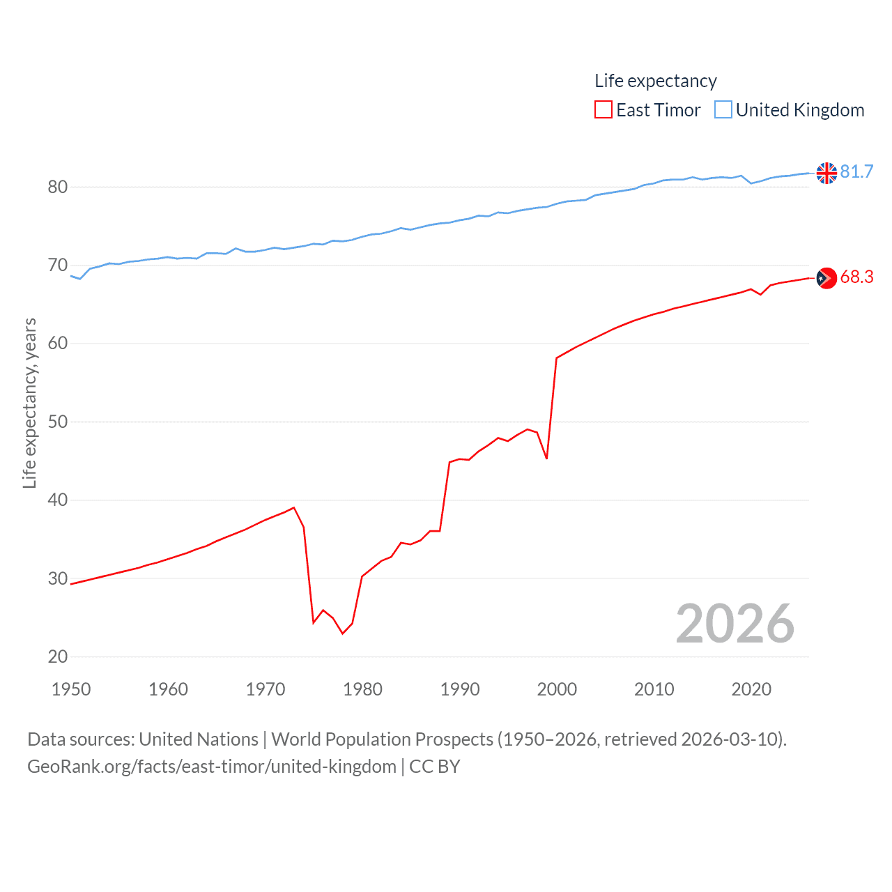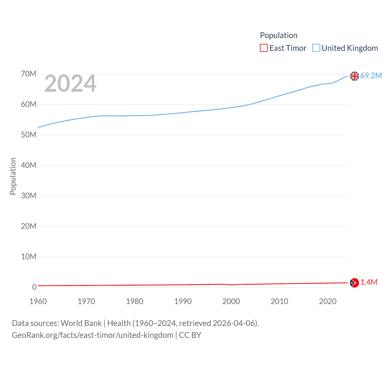 East Timor has a population of 1.4M (ranked 152/197), compared with 69.2M in The United Kingdom (ranked 21/197). East Timor's land area is 5,741 sq mi versus 93,410 sq mi for The United Kingdom (ranked 155th vs. 78th).