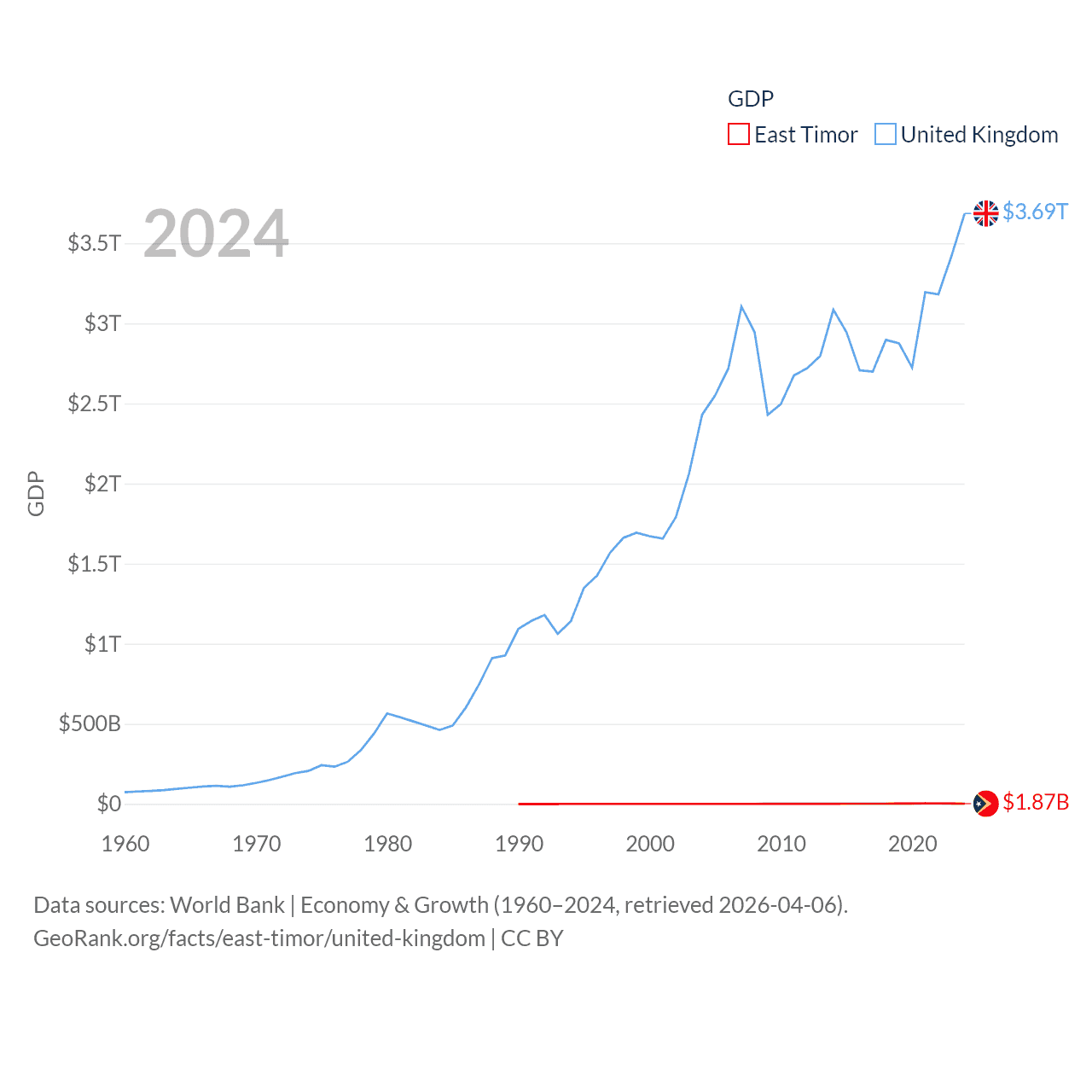 By GDP, East Timor ranks 181/197 ($1.87B) and The United Kingdom ranks 6/197 ($3.69T). By GDP per capita, East Timor ranks 167/197 ($1,332), while The United Kingdom ranks 22/197 ($53,246).