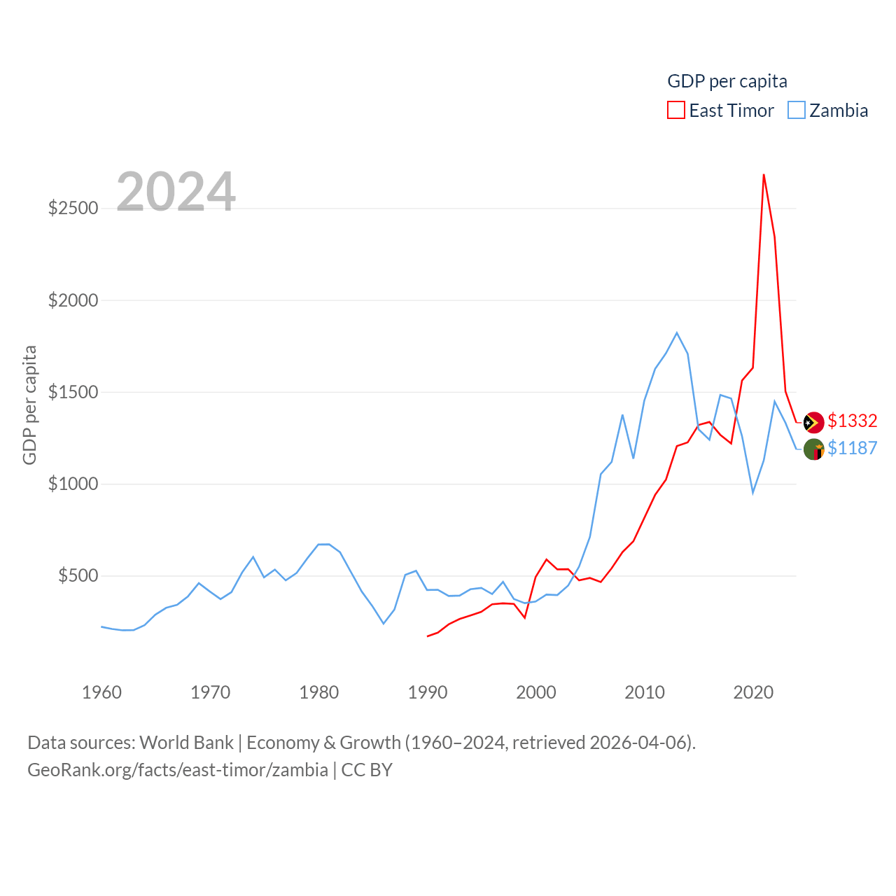 By GDP, East Timor ranks 181/197 ($1.87B) and Zambia ranks 116/197 ($25.3B). By GDP per capita, East Timor ranks 167/197 ($1,332), while Zambia ranks 169/197 ($1,187).