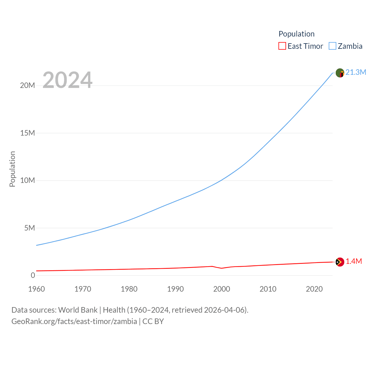 East Timor has a population of 1.4M (ranked 152/197), compared with 21.3M in Zambia (ranked 63/197). East Timor's land area is 5,741 sq mi versus 287,024 sq mi for Zambia (ranked 155th vs. 37th).