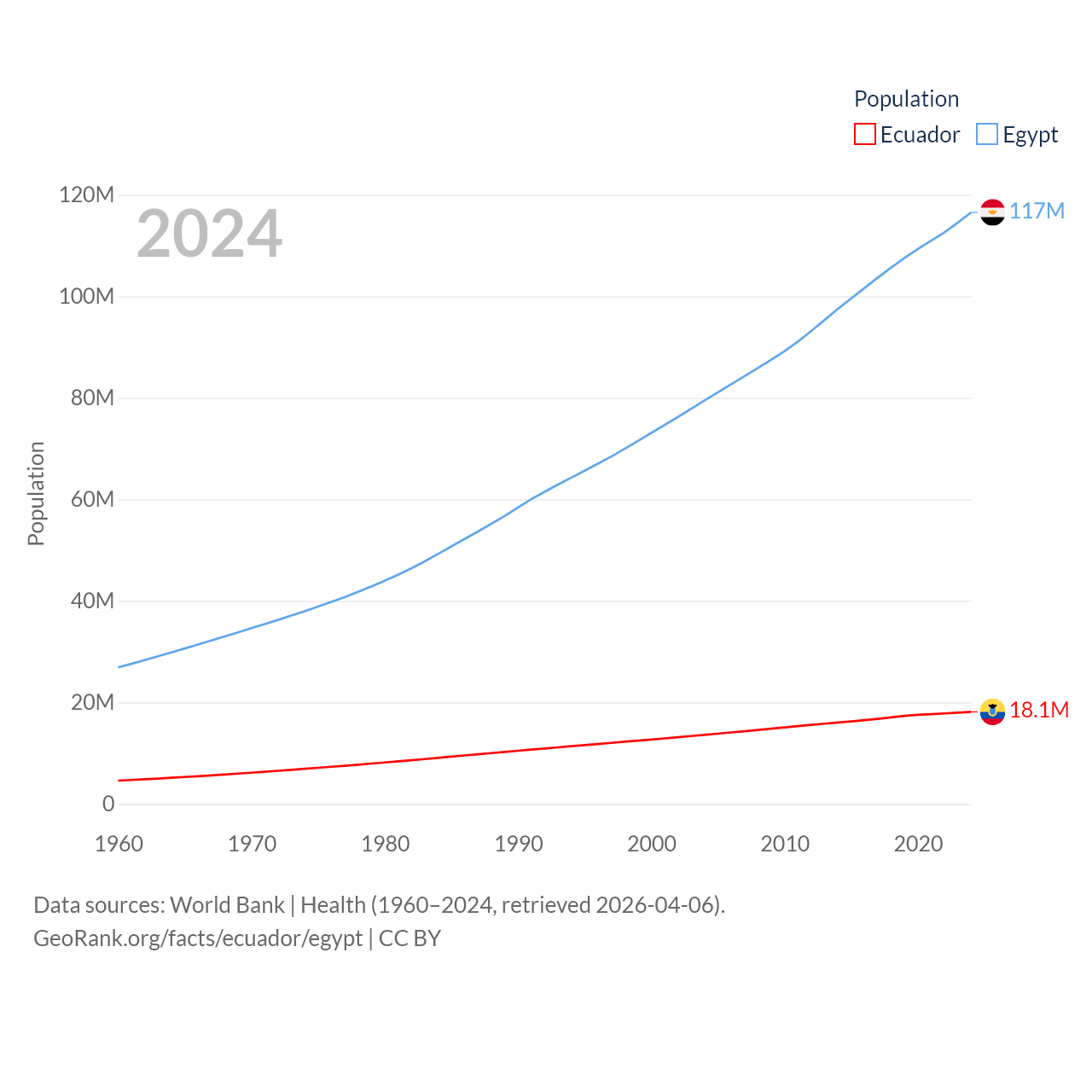 Ecuador has a population of 18.1M (ranked 71/197), compared with 117M in Egypt (ranked 13/197). Ecuador's land area is 95,892 sq mi versus 384,345 sq mi for Egypt (ranked 76th vs. 29th).