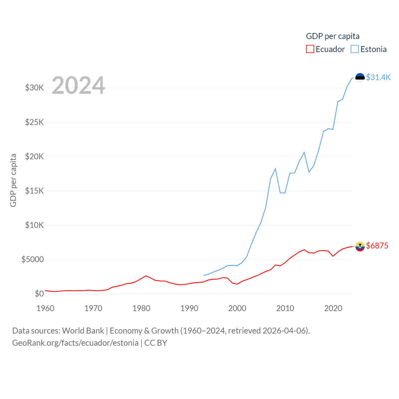 By GDP, Ecuador ranks 62/197 ($125B) and Estonia ranks 100/197 ($43.1B). By GDP per capita, Ecuador ranks 103/197 ($6,875), while Estonia ranks 40/197 ($31,428).