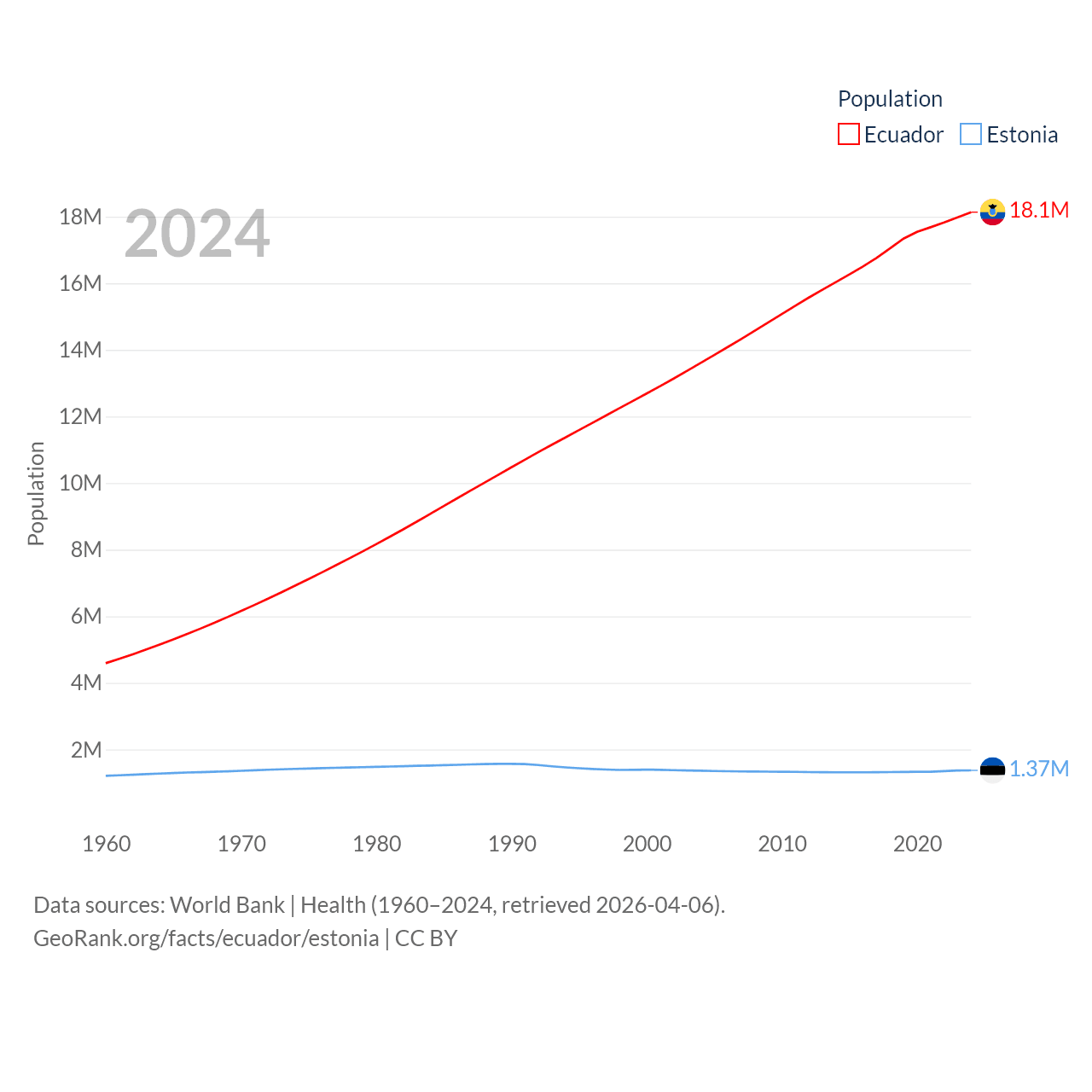 Ecuador has a population of 18.1M (ranked 71/197), compared with 1.37M in Estonia (ranked 153/197). Ecuador's land area is 95,892 sq mi versus 16,498 sq mi for Estonia (ranked 76th vs. 129th).