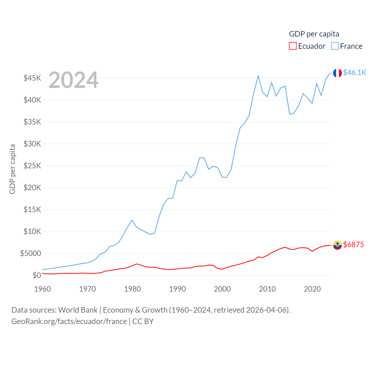 By GDP, Ecuador ranks 62/197 ($125B) and France ranks 7/197 ($3.16T). By GDP per capita, Ecuador ranks 103/197 ($6,875), while France ranks 27/197 ($46,103).