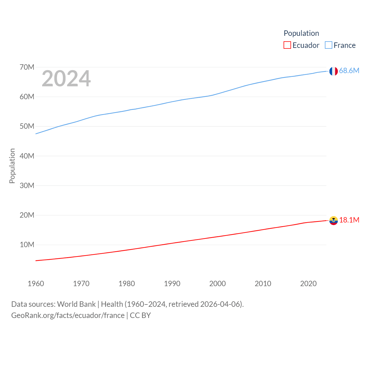 Ecuador has a population of 18.1M (ranked 71/197), compared with 68.6M in France (ranked 23/197). Ecuador's land area is 95,892 sq mi versus 208,090 sq mi for France (ranked 76th vs. 48th).