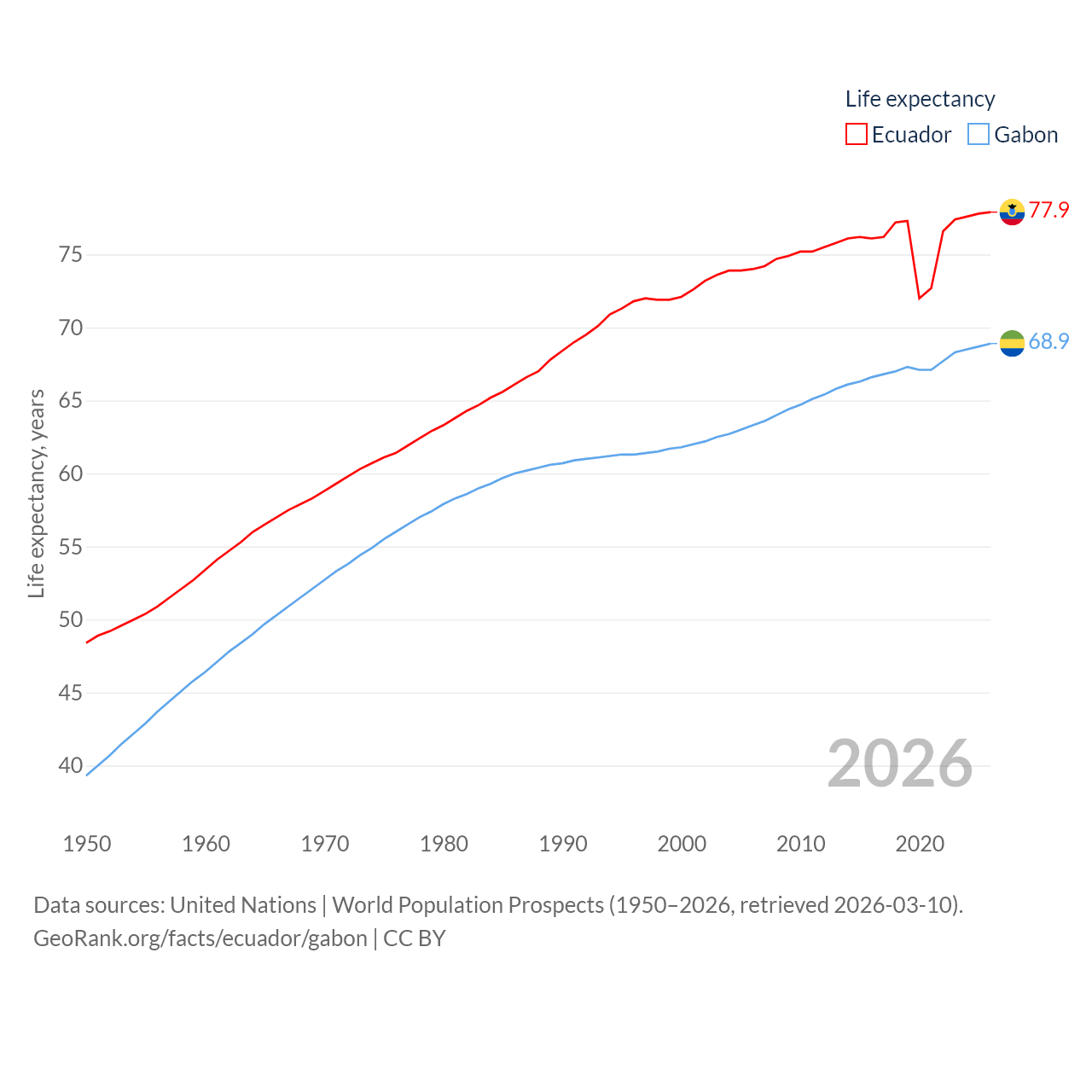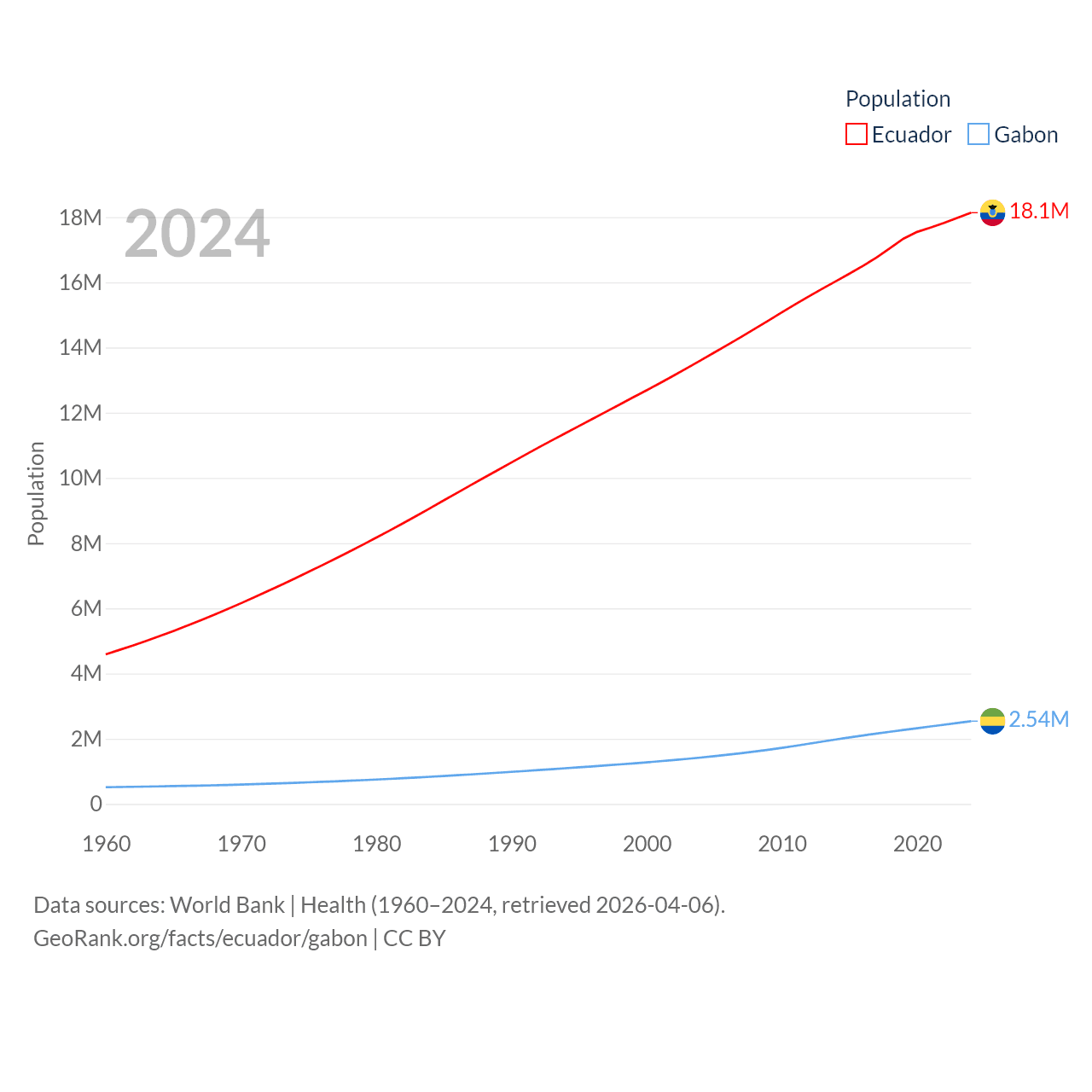 Ecuador has a population of 18.1M (ranked 71/197), compared with 2.54M in Gabon (ranked 141/197). Ecuador's land area is 95,892 sq mi versus 99,487 sq mi for Gabon (ranked 76th vs. 75th).