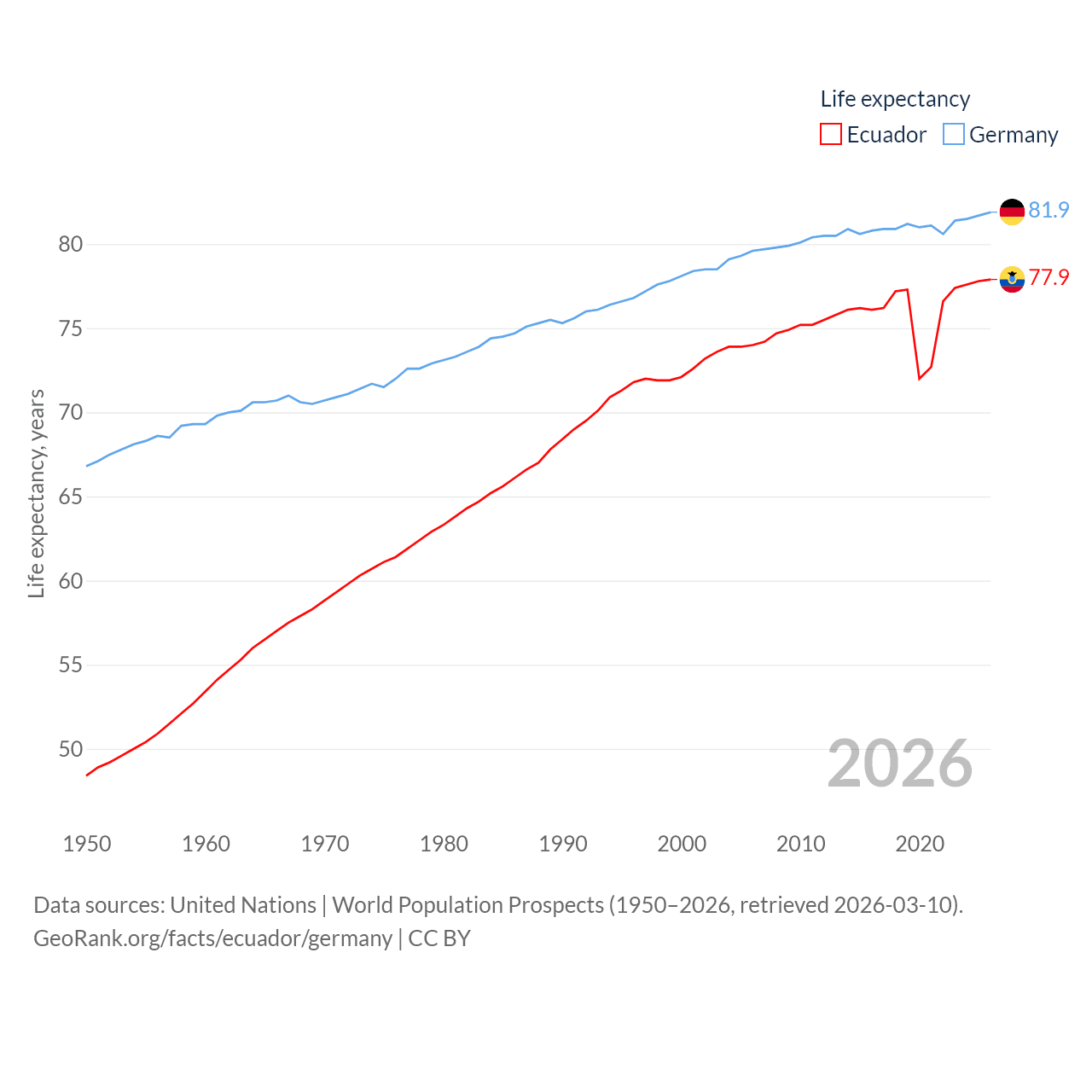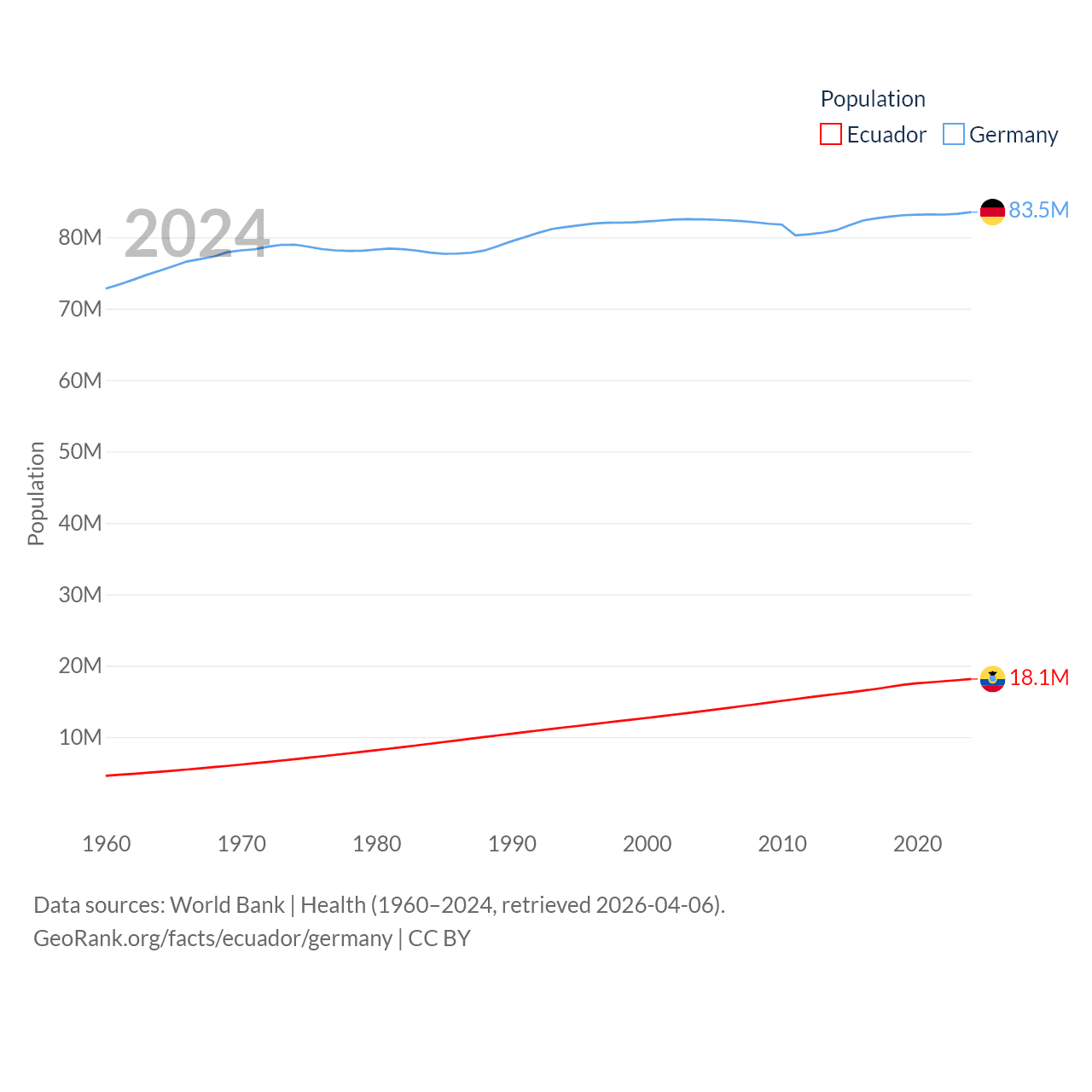 Ecuador has a population of 18.1M (ranked 71/197), compared with 83.5M in Germany (ranked 19/197). Ecuador's land area is 95,892 sq mi versus 134,916 sq mi for Germany (ranked 76th vs. 63rd).