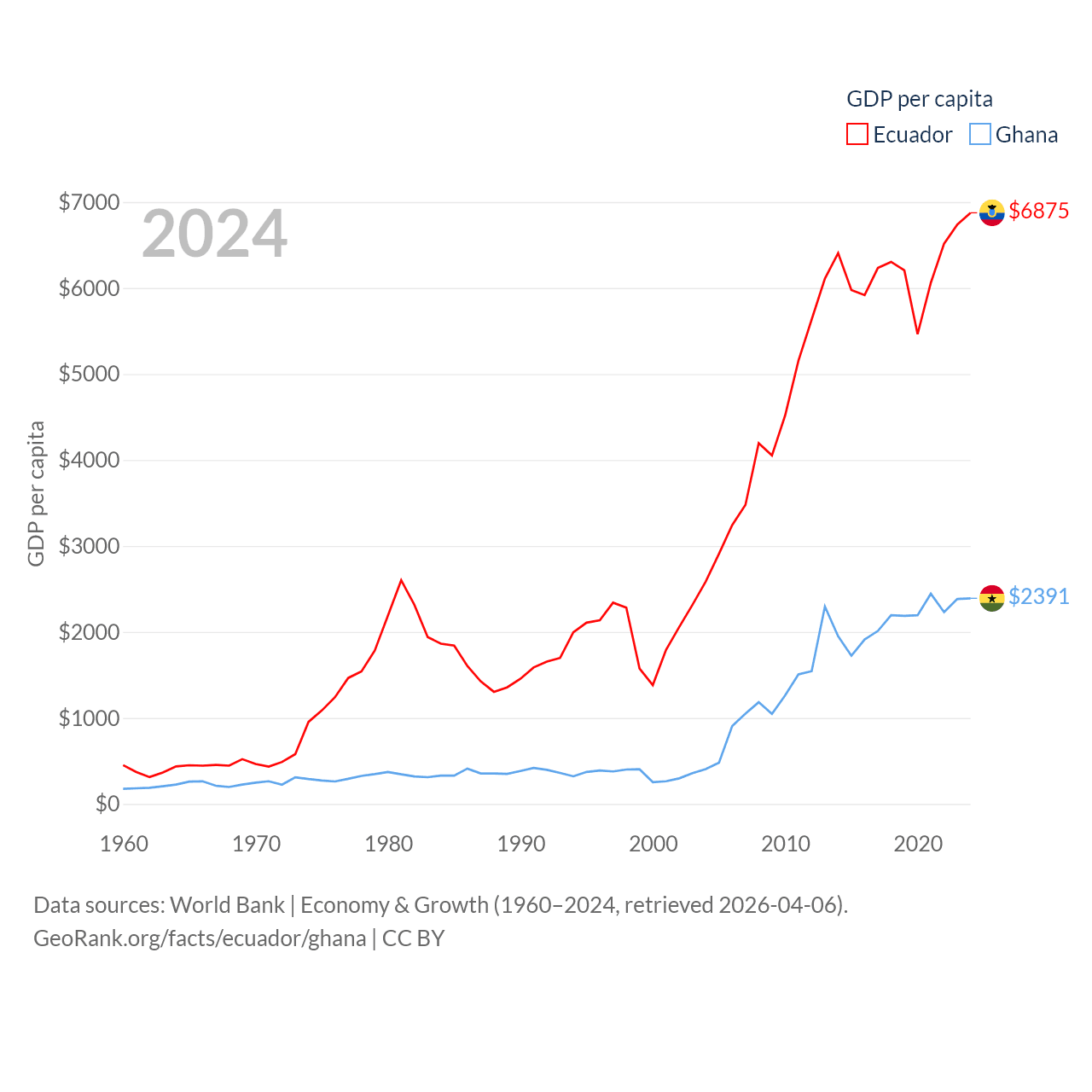 By GDP, Ecuador ranks 62/197 ($125B) and Ghana ranks 80/197 ($82.3B). By GDP per capita, Ecuador ranks 103/197 ($6,875), while Ghana ranks 151/197 ($2,391).
