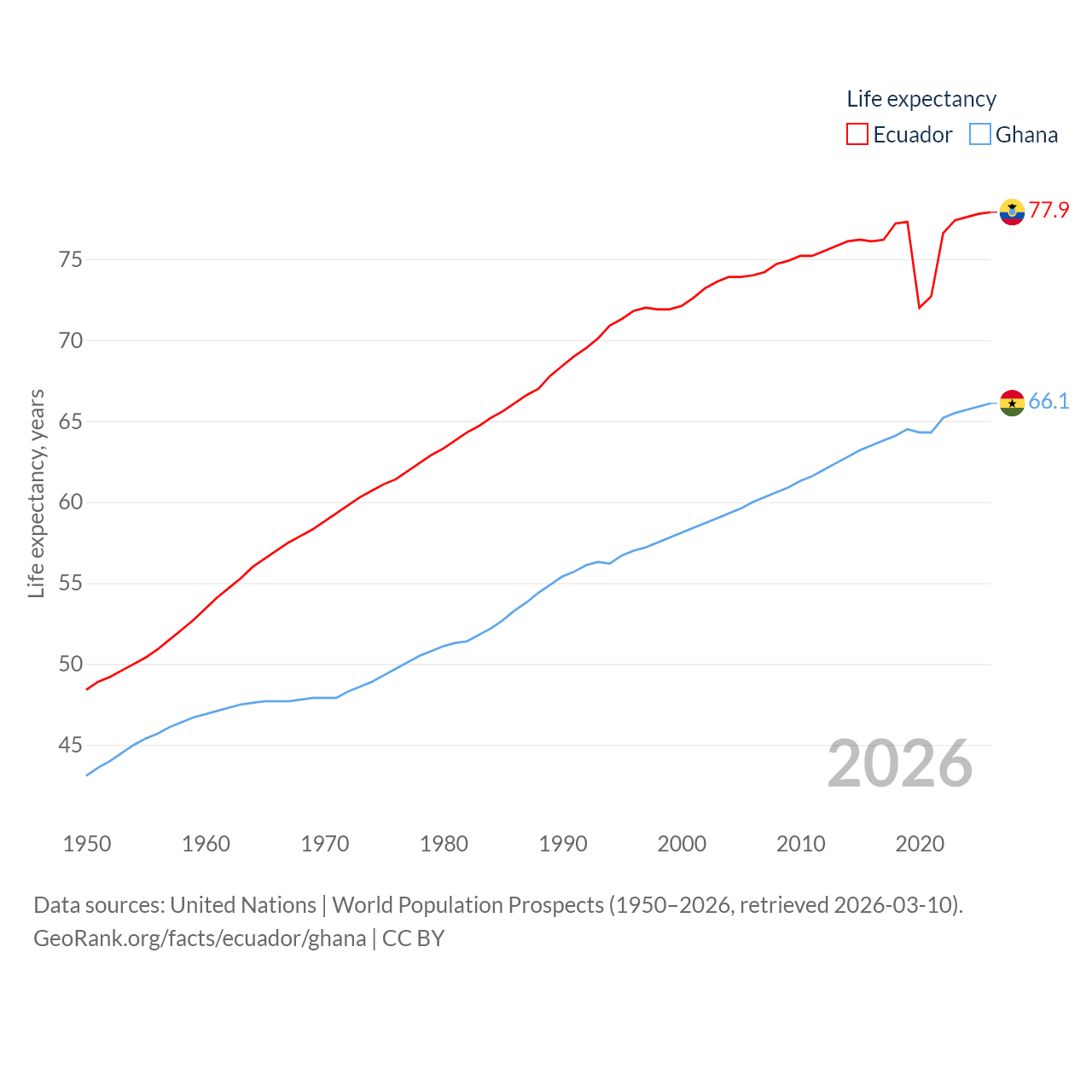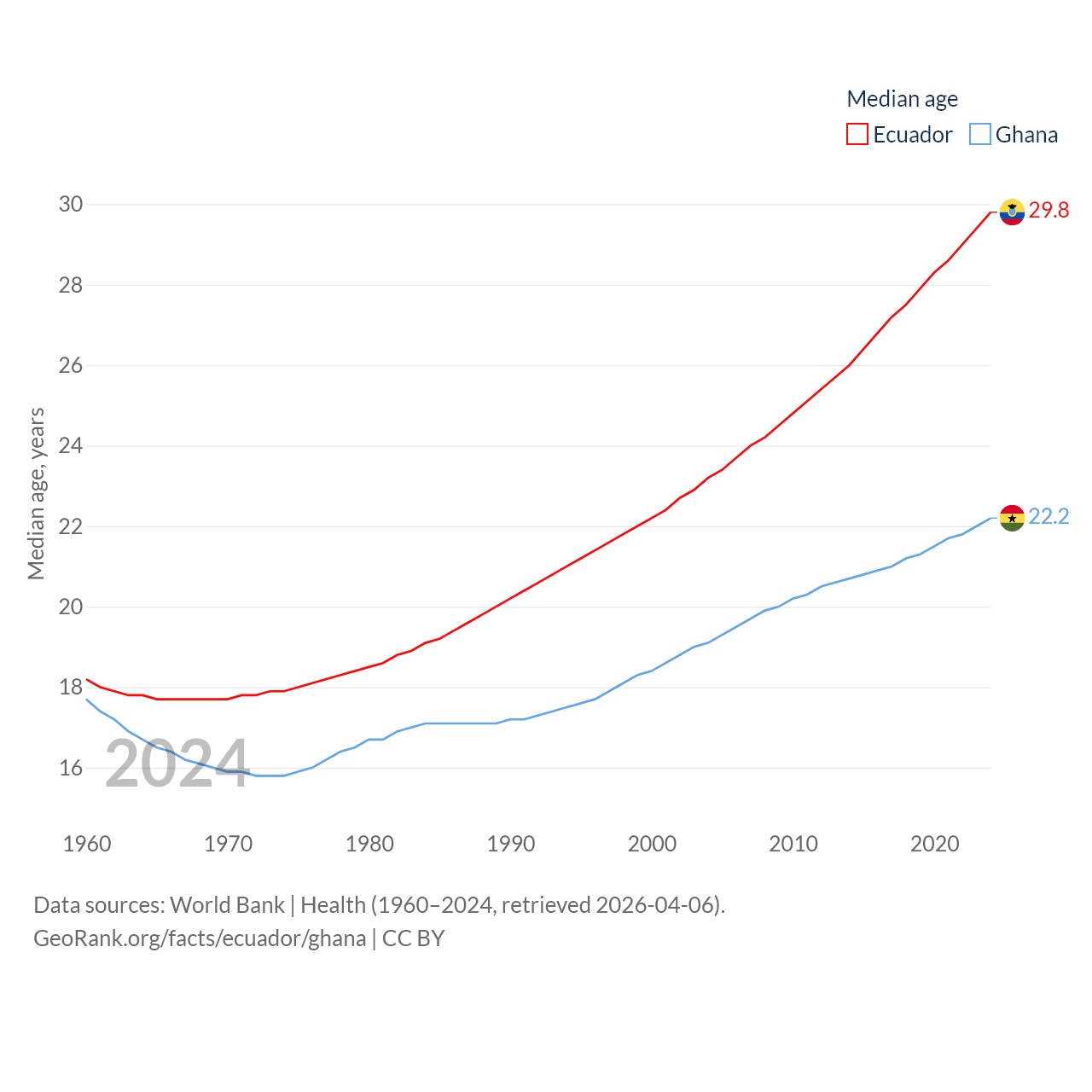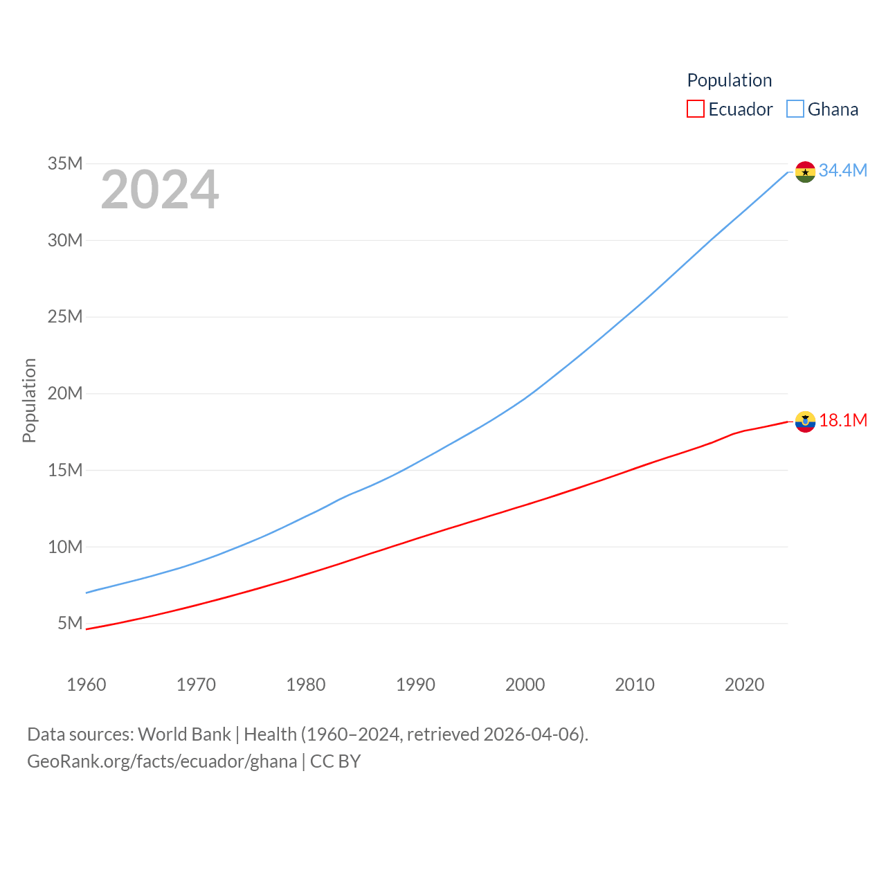 Ecuador has a population of 18.1M (ranked 71/197), compared with 34.4M in Ghana (ranked 47/197). Ecuador's land area is 95,892 sq mi versus 87,851 sq mi for Ghana (ranked 76th vs. 81st).