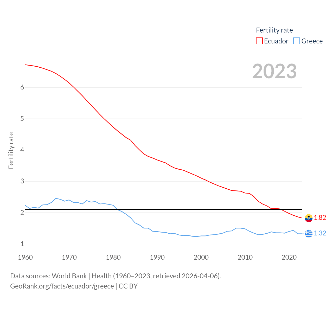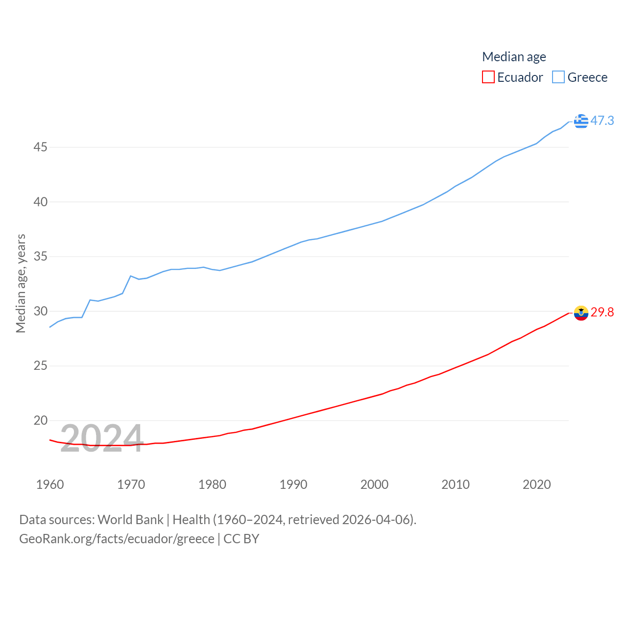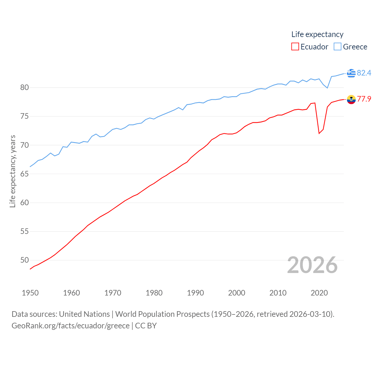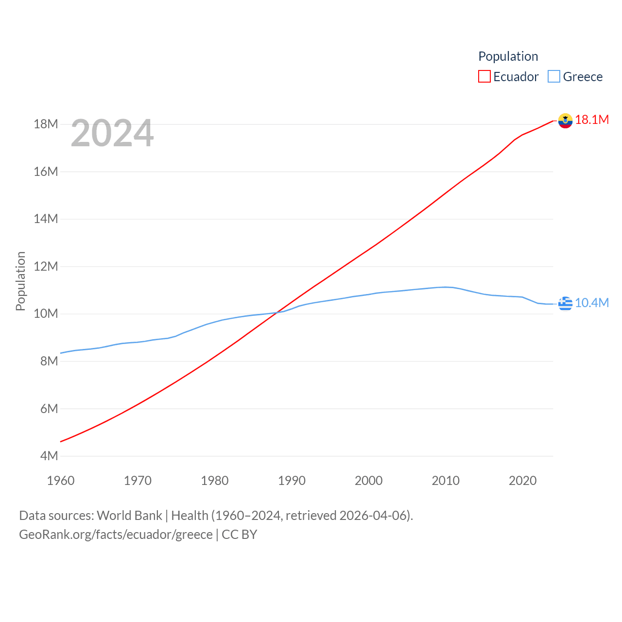 Ecuador has a population of 18.1M (ranked 71/197), compared with 10.4M in Greece (ranked 94/197). Ecuador's land area is 95,892 sq mi versus 49,769 sq mi for Greece (ranked 76th vs. 95th).