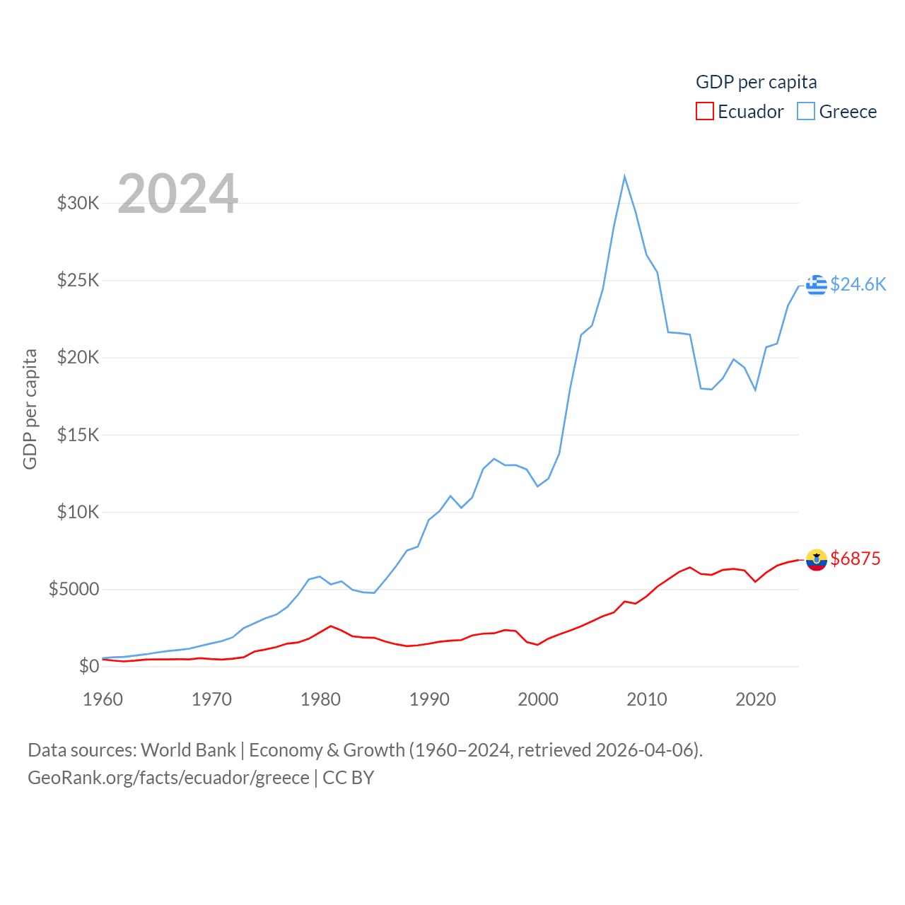 By GDP, Ecuador ranks 62/197 ($125B) and Greece ranks 53/197 ($256B). By GDP per capita, Ecuador ranks 103/197 ($6,875), while Greece ranks 49/197 ($24,626).