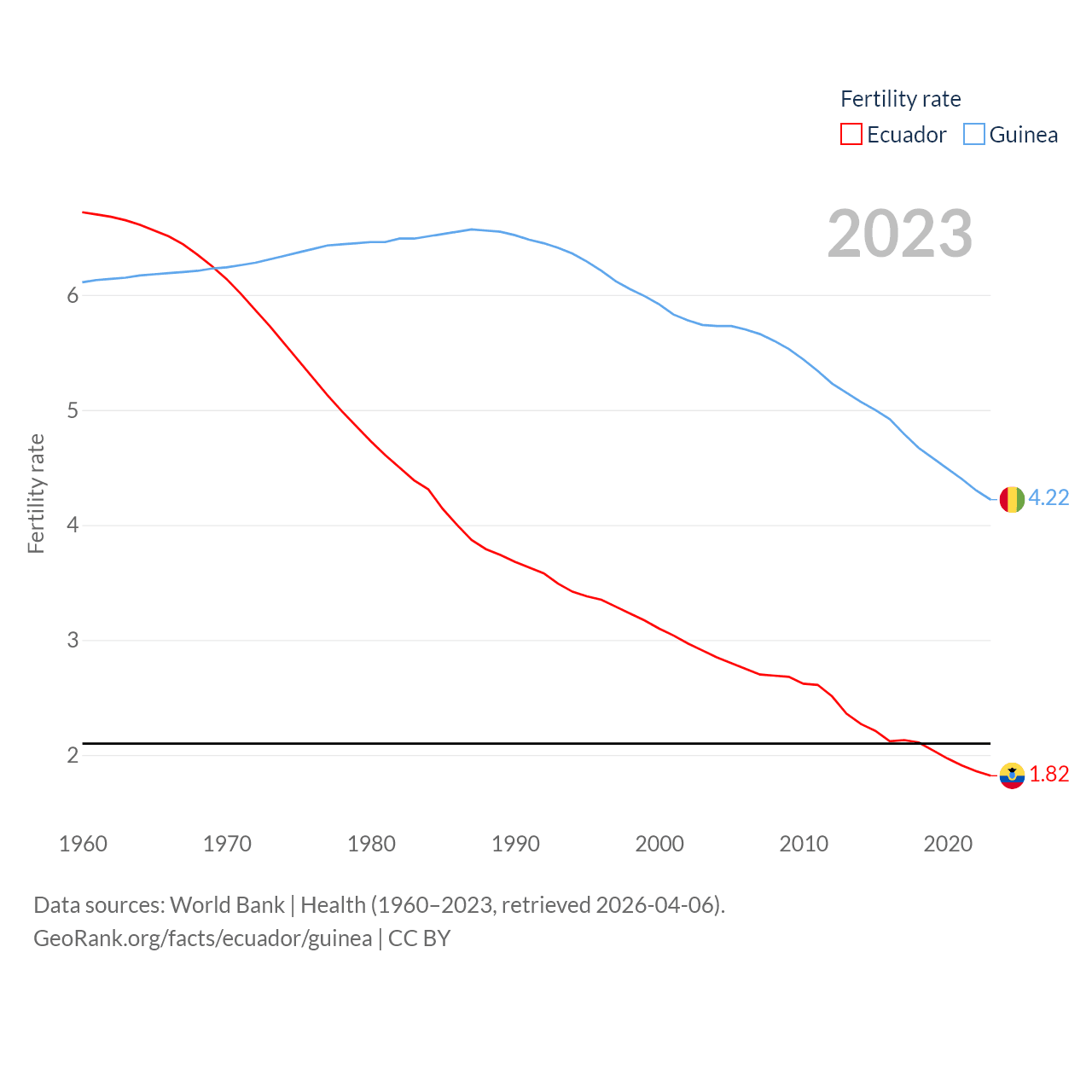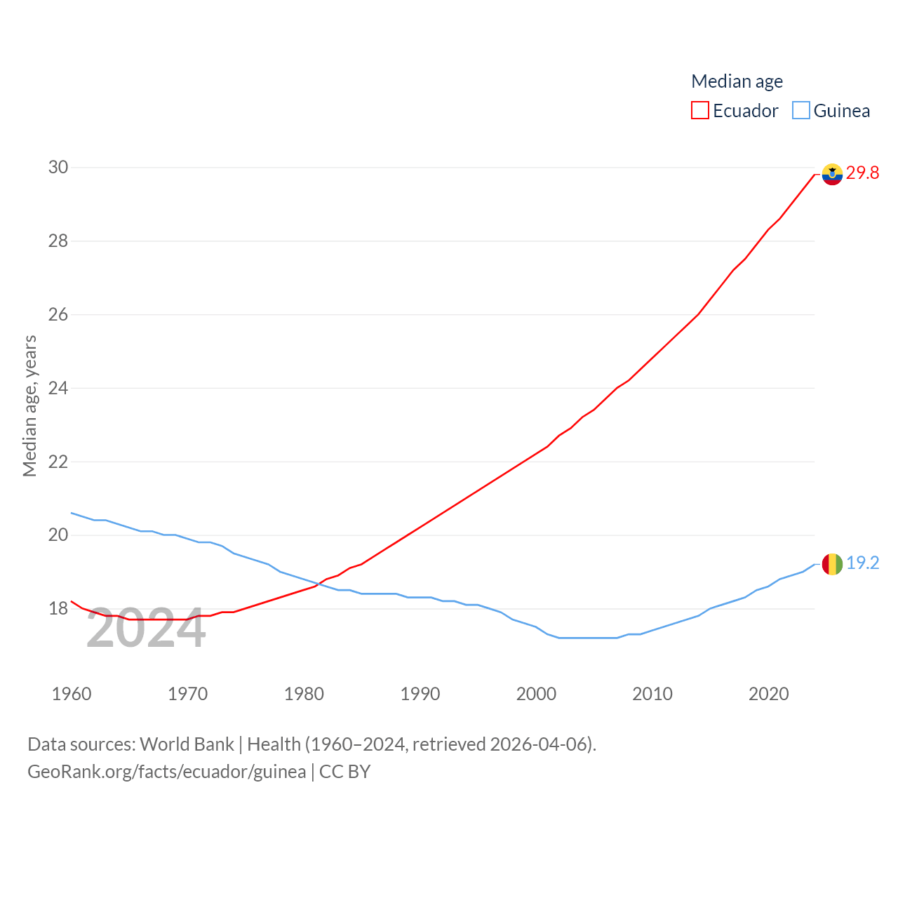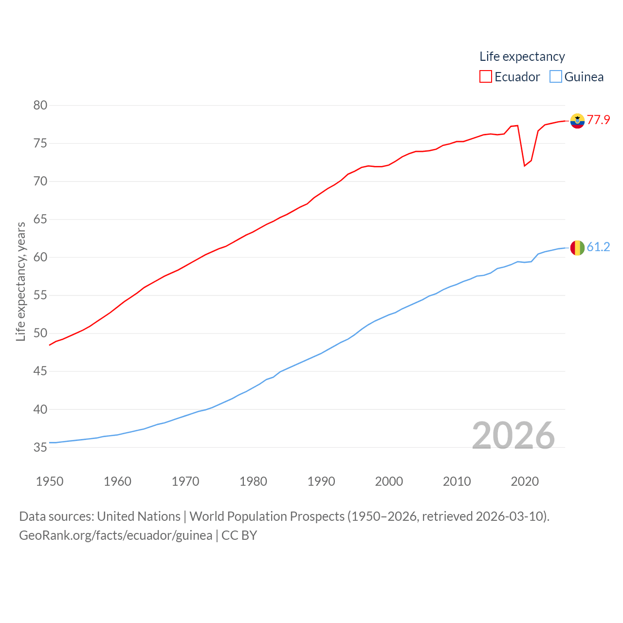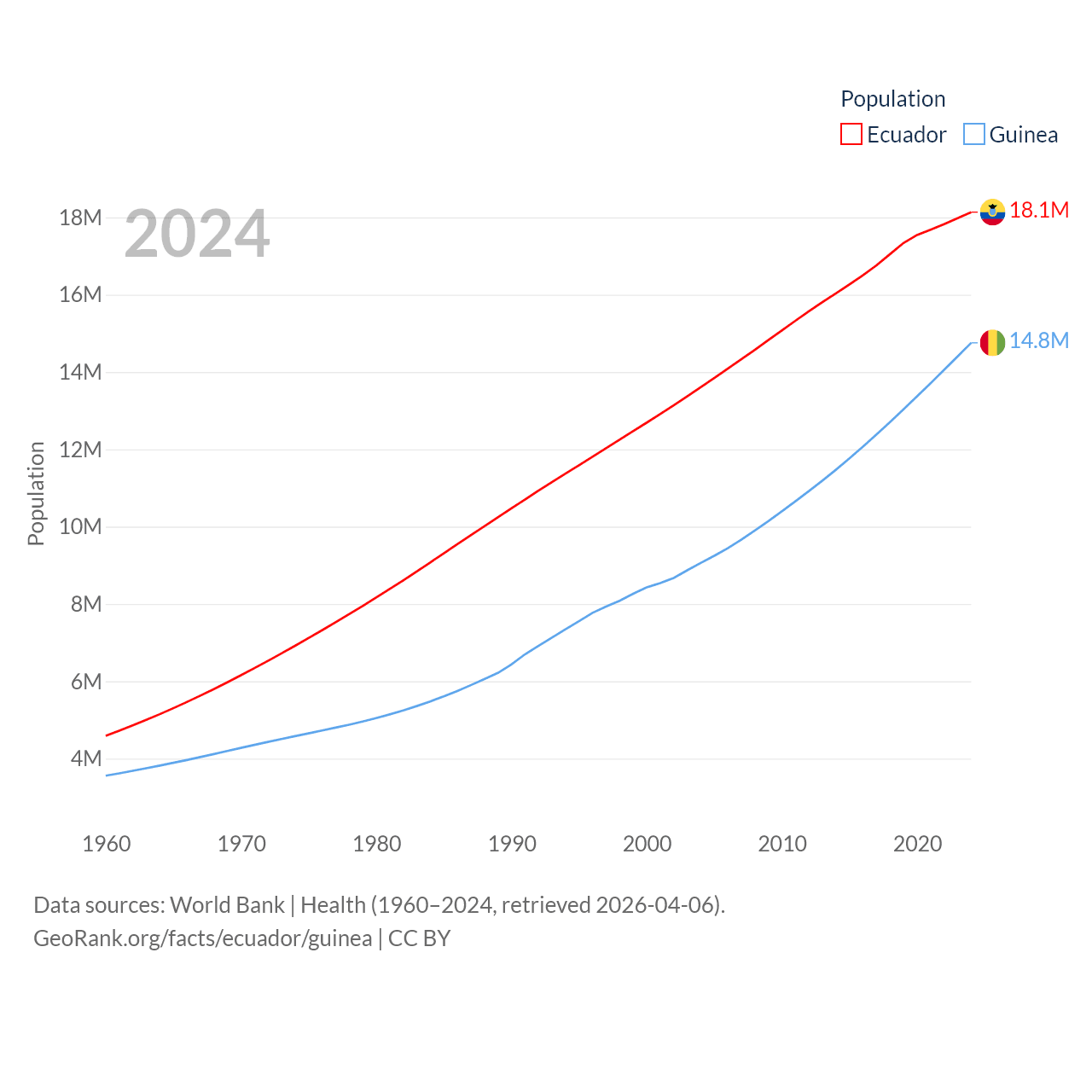 Ecuador has a population of 18.1M (ranked 71/197), compared with 14.8M in Guinea (ranked 75/197). Ecuador's land area is 95,892 sq mi versus 94,873 sq mi for Guinea (ranked 76th vs. 77th).