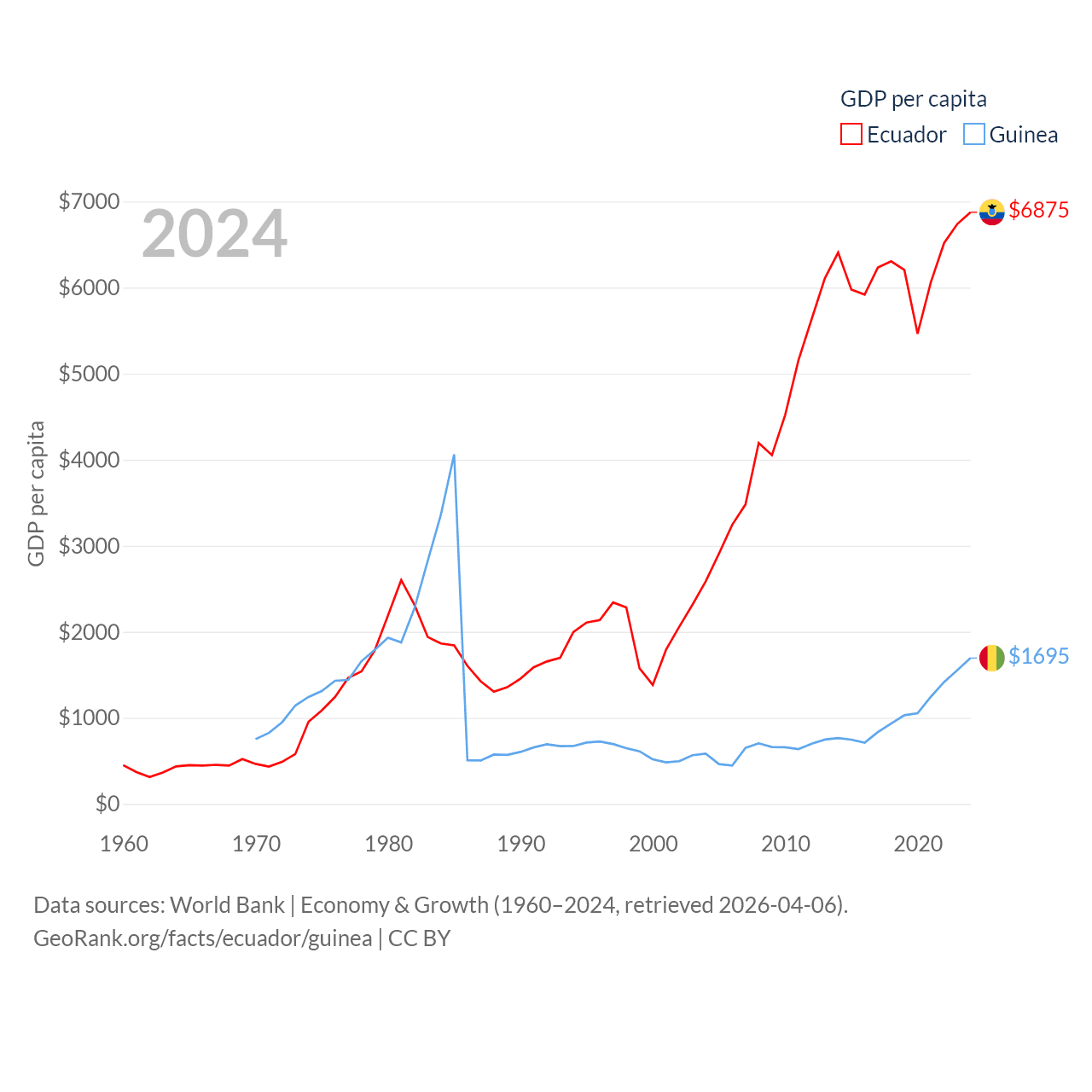 By GDP, Ecuador ranks 62/197 ($125B) and Guinea ranks 118/197 ($25B). By GDP per capita, Ecuador ranks 103/197 ($6,875), while Guinea ranks 160/197 ($1,695).