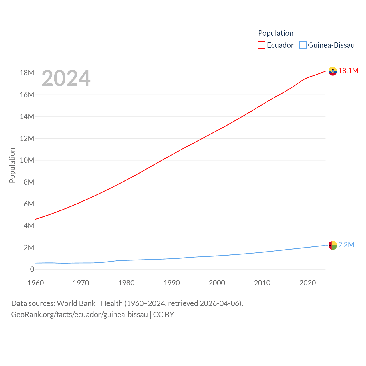 Ecuador has a population of 18.1M (ranked 71/197), compared with 2.2M in Guinea-Bissau (ranked 146/197). Ecuador's land area is 95,892 sq mi versus 10,857 sq mi for Guinea-Bissau (ranked 76th vs. 139th).